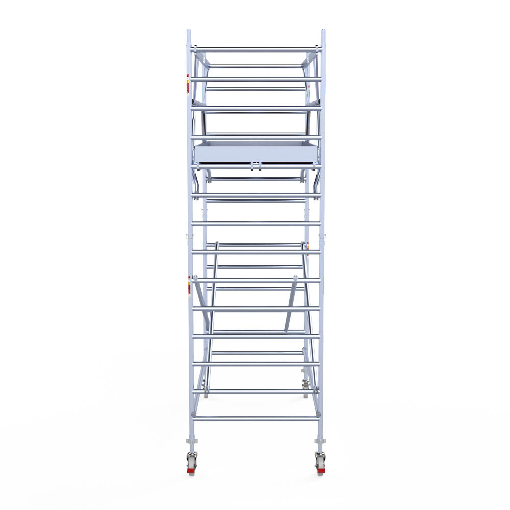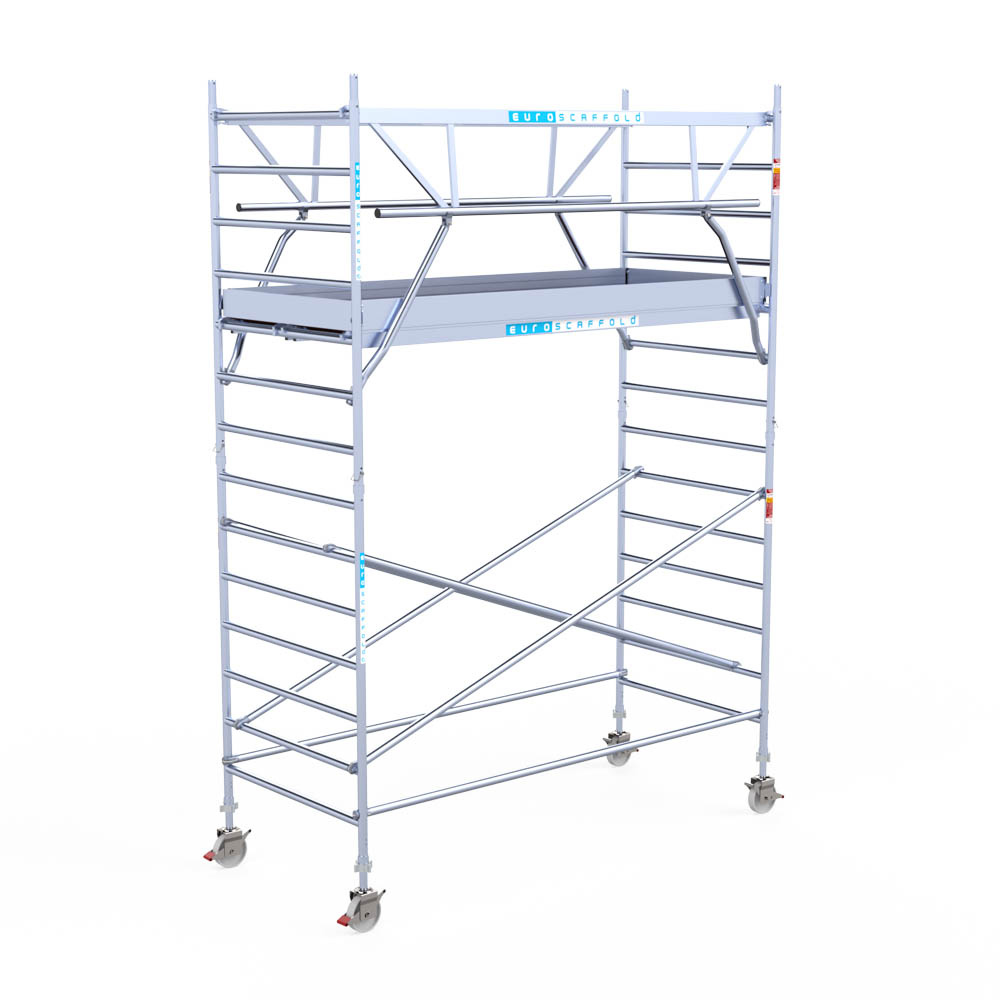 Let wel; Door de vernieuwde EN 1004 norm en het A-blad rolsteigers voldoen de Euroscaffold Euro met enkel schoren zonder voorloopleuning niet meer aan de regelgeving voor zakelijk gebruik. De Euro uitvoering met voorloopleuningen voldoen hier wel aan. Voor particulier gebruik is de uitvoering met schoren wel voldoende.