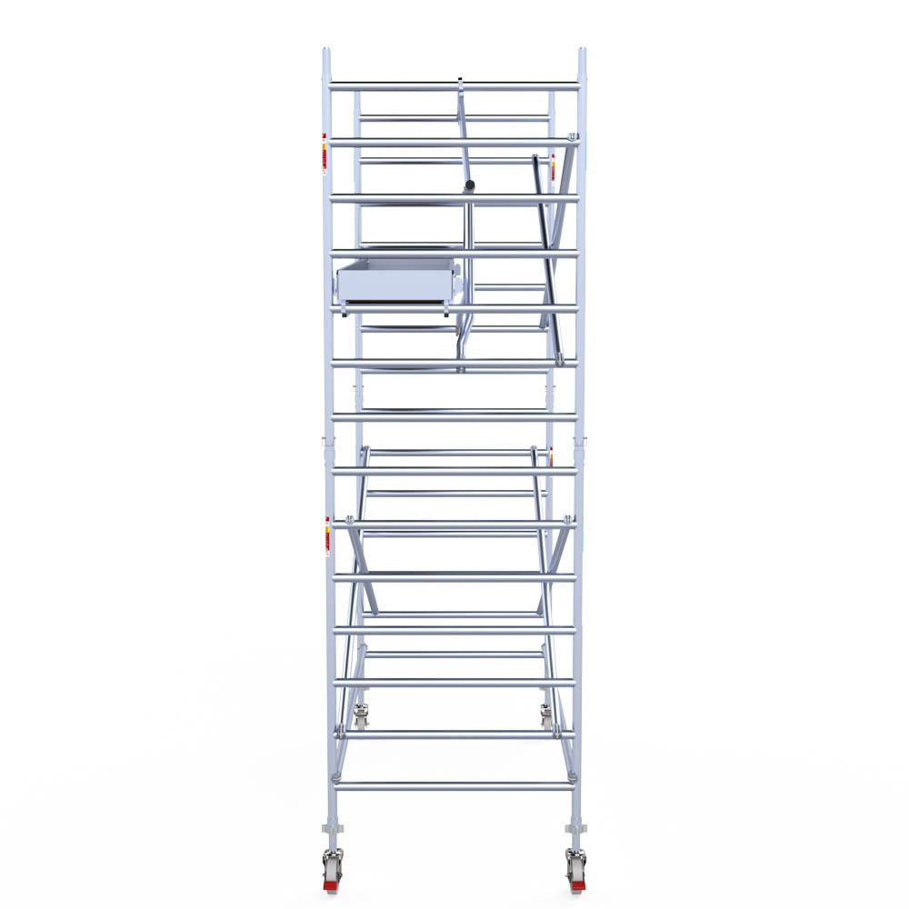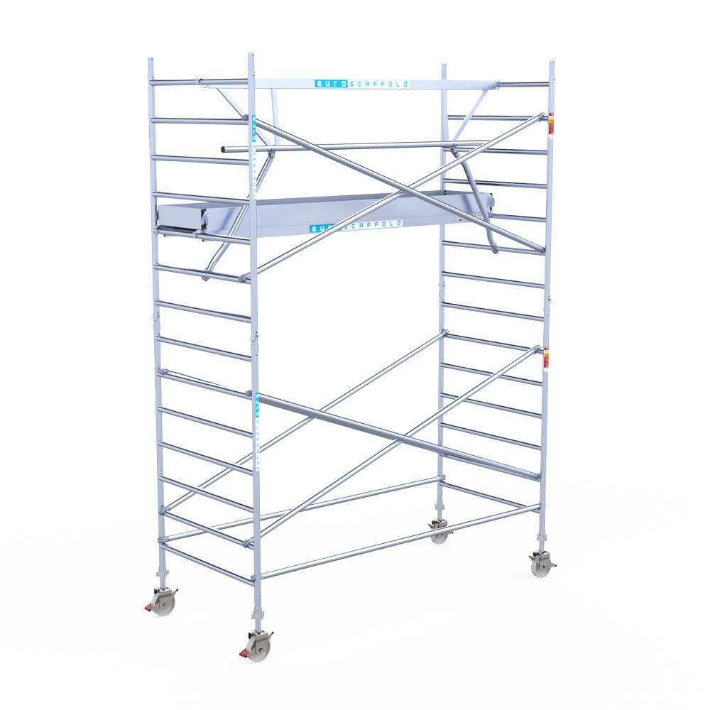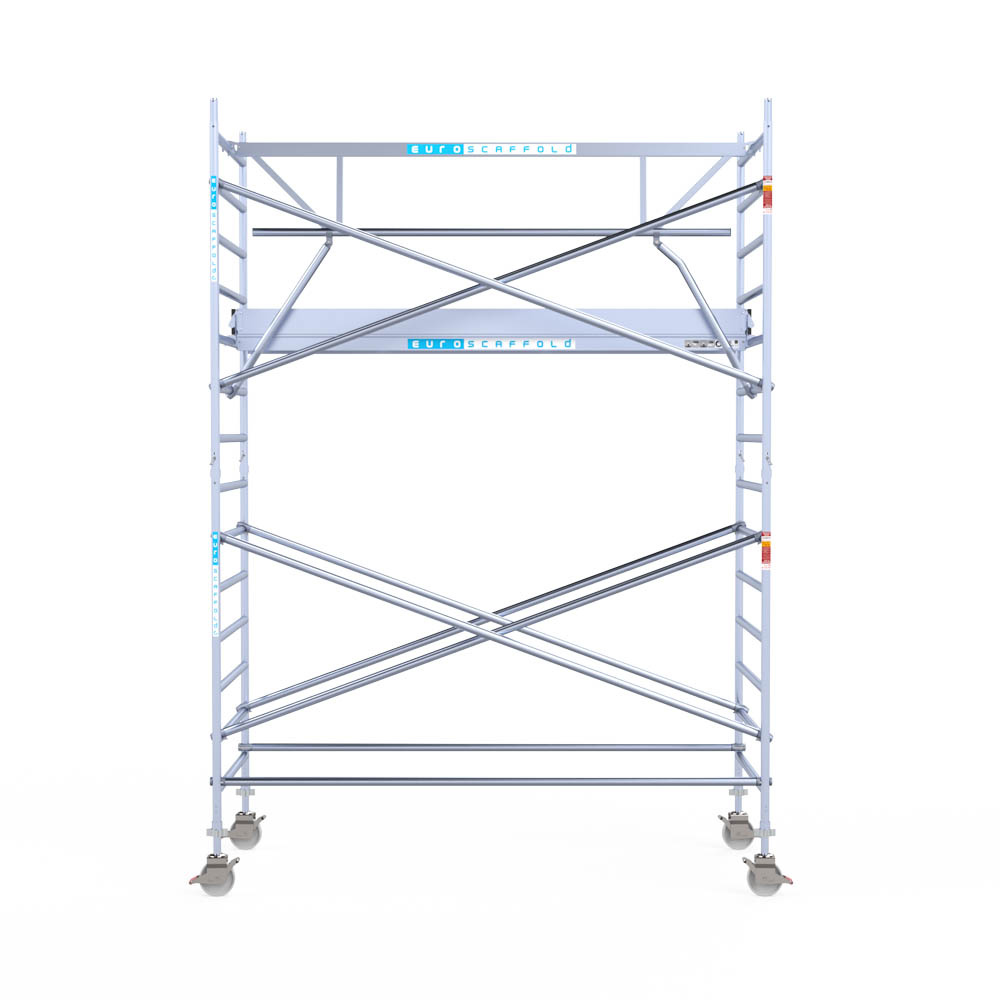 Let wel; Door de vernieuwde EN 1004 norm en het A-blad rolsteigers voldoen de Euroscaffold Euro met enkel schoren zonder voorloopleuning niet meer aan de regelgeving voor zakelijk gebruik. De Euro uitvoering met voorloopleuningen voldoen hier wel aan. Voor particulier gebruik is de uitvoering met schoren wel voldoende.