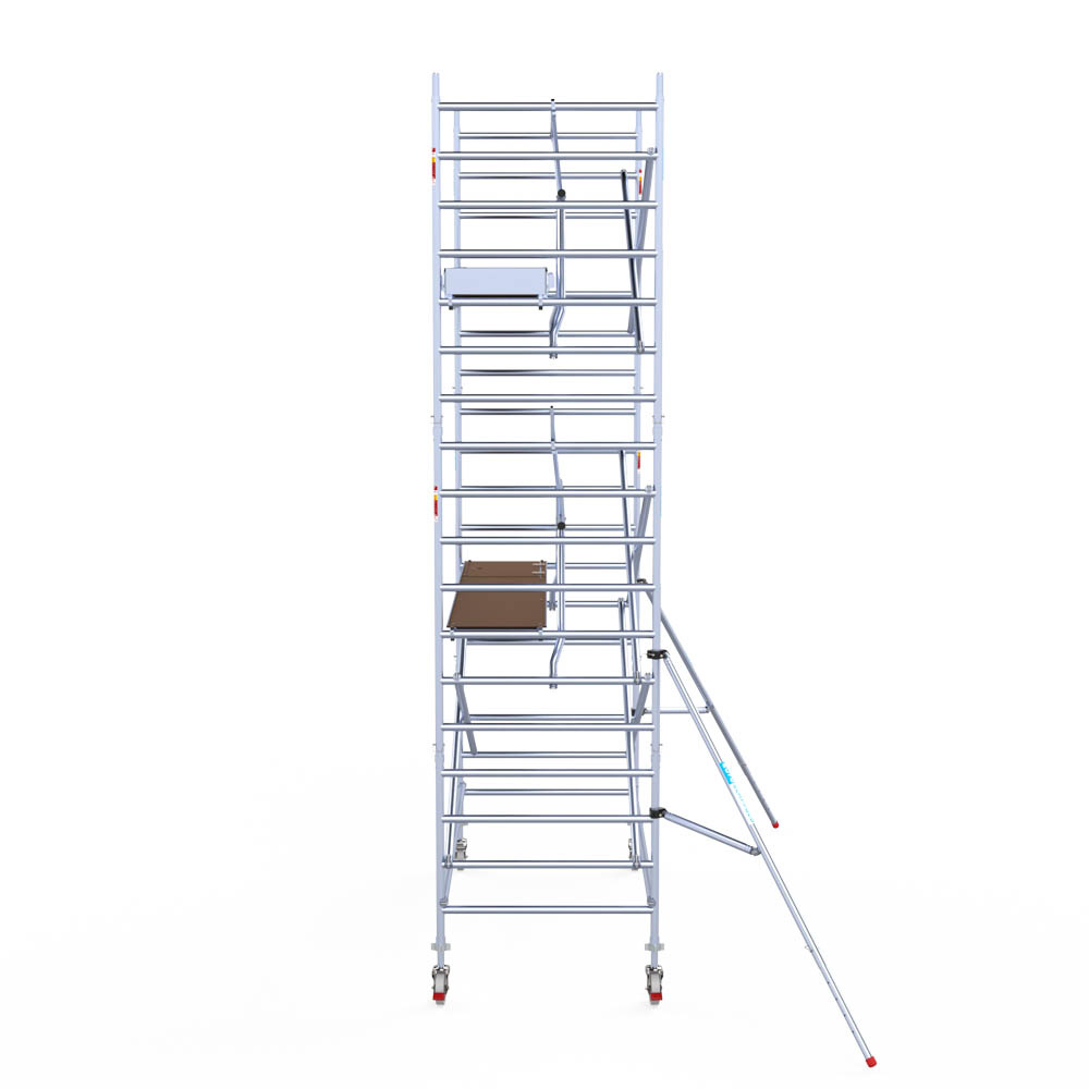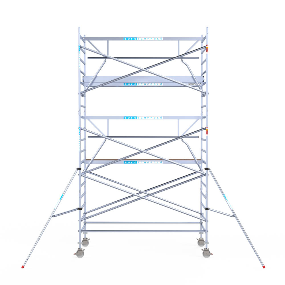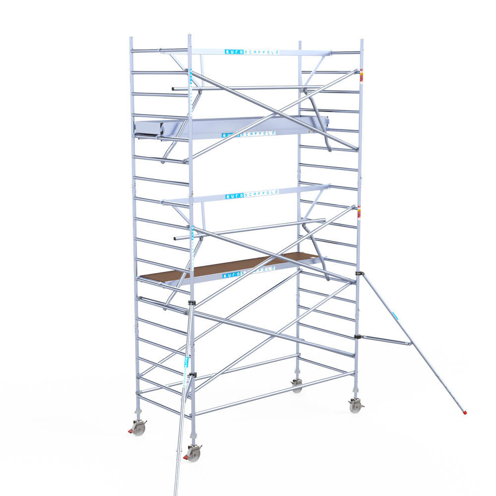 Let wel; Door de vernieuwde EN 1004 norm en het A-blad rolsteigers voldoen de Euroscaffold Euro met enkel schoren zonder voorloopleuning niet meer aan de regelgeving voor zakelijk gebruik. De Euro uitvoering met voorloopleuningen voldoen hier wel aan. Voor particulier gebruik is de uitvoering met schoren wel voldoende.