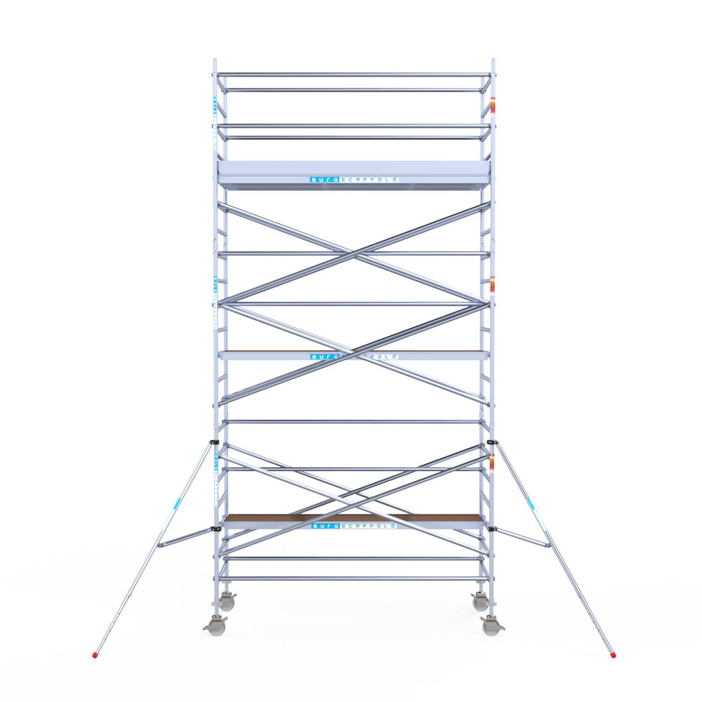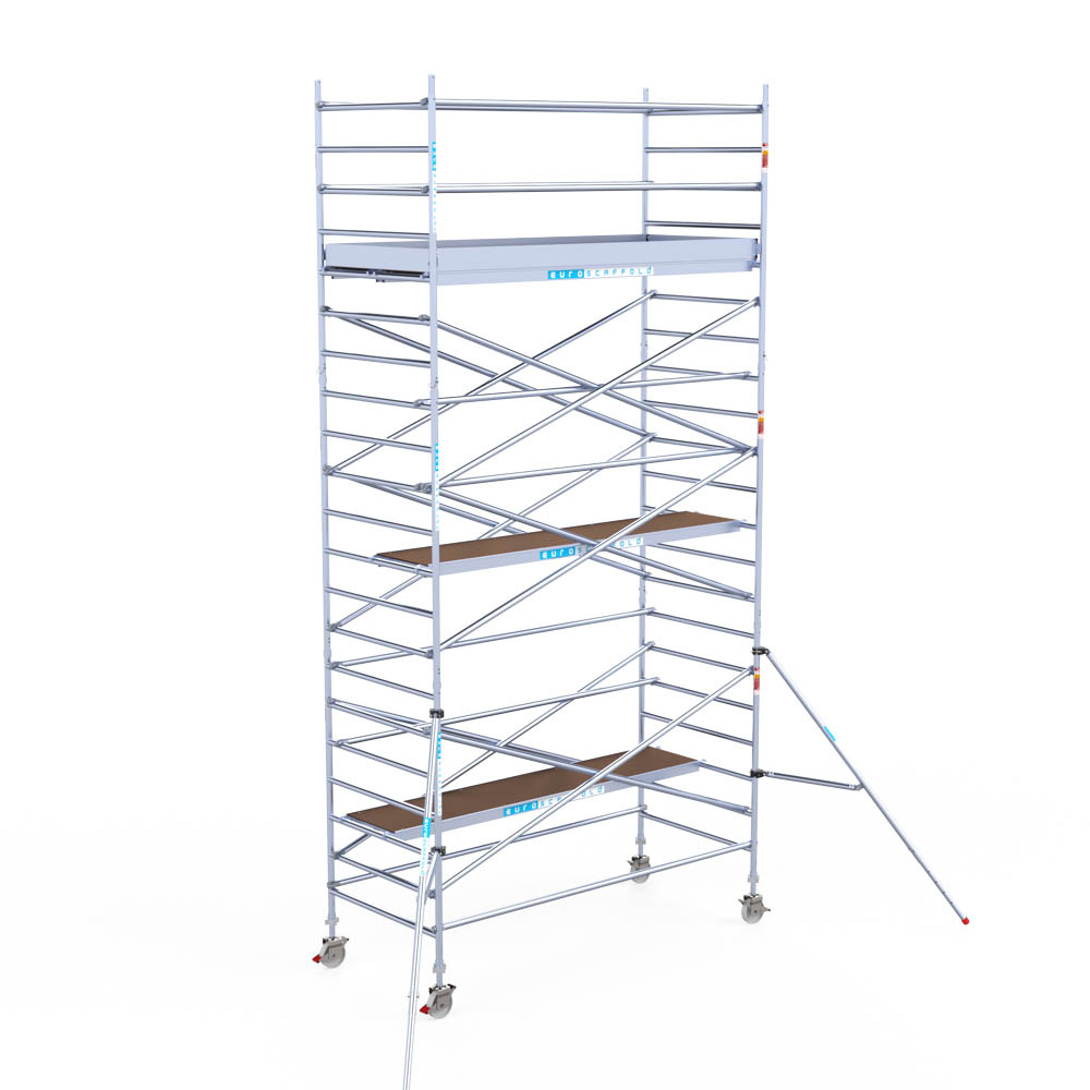 Let wel; Door de vernieuwde EN 1004 norm en het A-blad rolsteigers voldoen de Euroscaffold Euro met enkel schoren zonder voorloopleuning niet meer aan de regelgeving voor zakelijk gebruik. De Euro uitvoering met voorloopleuningen voldoen hier wel aan. Voor particulier gebruik is de uitvoering met schoren wel voldoende.