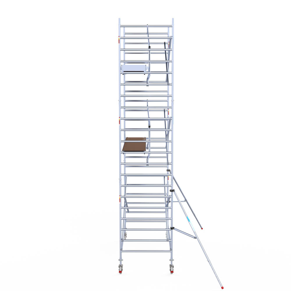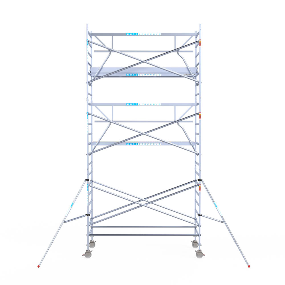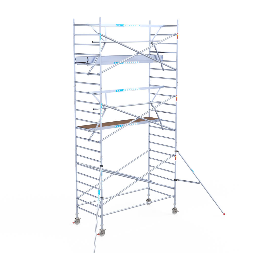 Let wel; Door de vernieuwde EN 1004 norm en het A-blad rolsteigers voldoen de Euroscaffold Euro met enkel schoren zonder voorloopleuning niet meer aan de regelgeving voor zakelijk gebruik. De Euro uitvoering met voorloopleuningen voldoen hier wel aan. Voor particulier gebruik is de uitvoering met schoren wel voldoende.