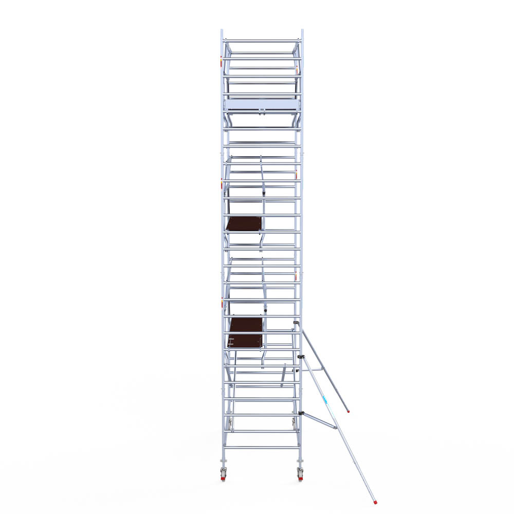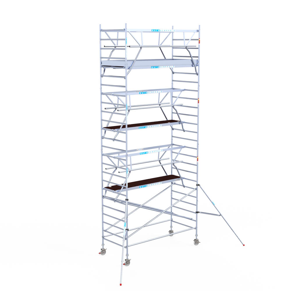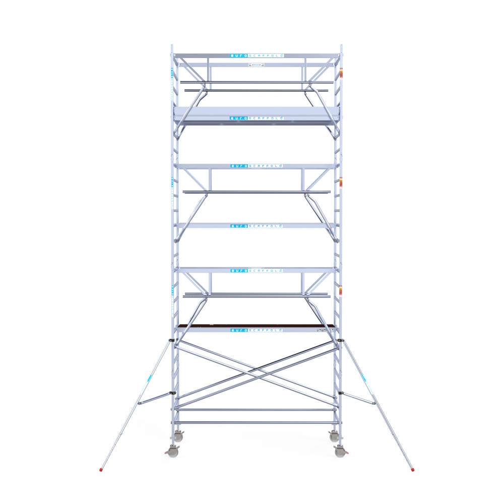 Let wel; Door de vernieuwde EN 1004 norm en het A-blad rolsteigers voldoen de Euroscaffold Euro met enkel schoren zonder voorloopleuning niet meer aan de regelgeving voor zakelijk gebruik. De Euro uitvoering met voorloopleuningen voldoen hier wel aan. Voor particulier gebruik is de uitvoering met schoren wel voldoende.