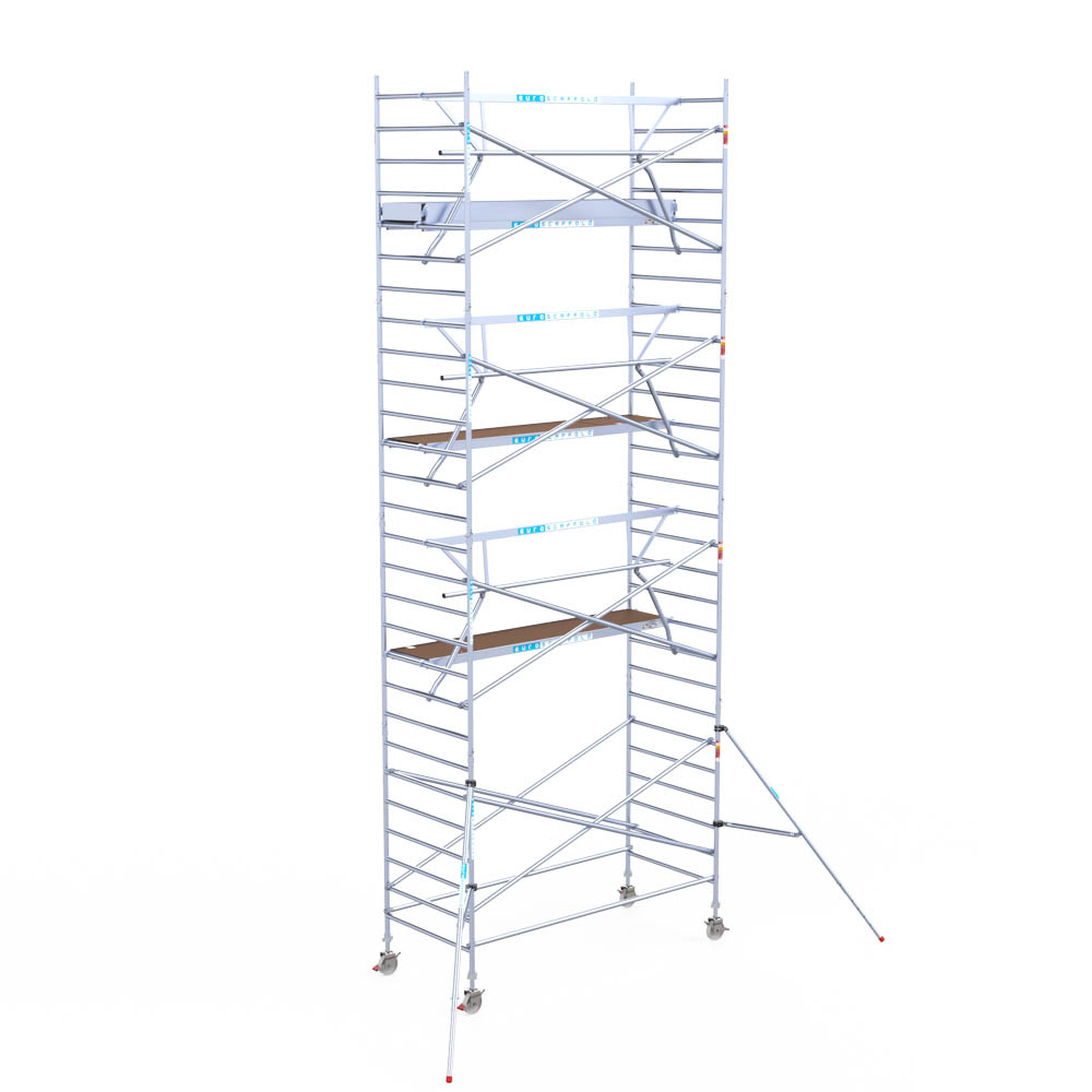 Deze rolsteiger heeft een steigerbreedte van 135, wat voor stabiliteit en stevigheid zorgt. De platformlengte is 305, wat voldoende werkruimte biedt. De werkhoogte van de rolsteiger is 9,2, waardoor je veilig op de gewenste hoogte kunt werken.