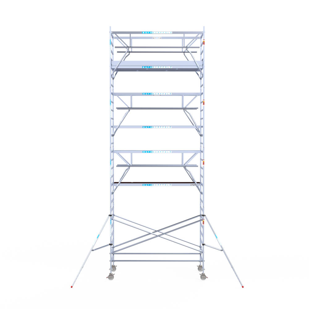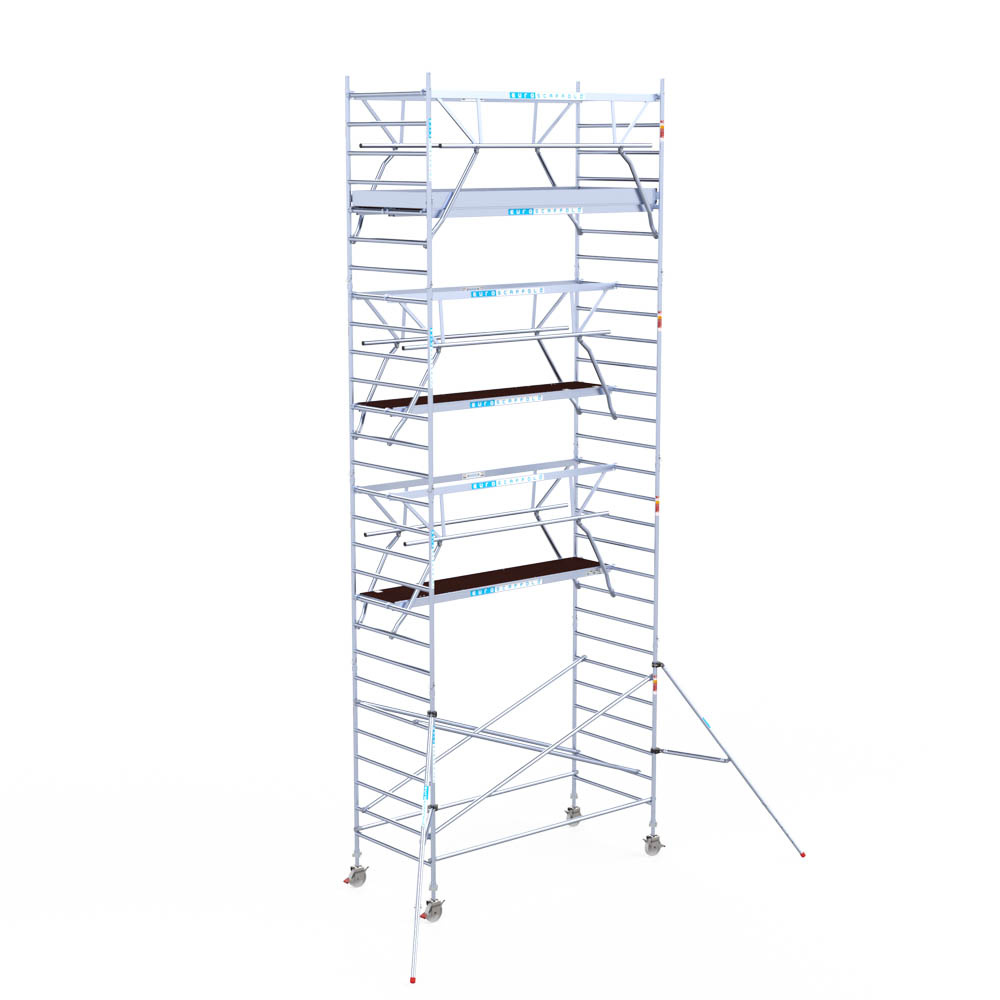 Let wel; Door de vernieuwde EN 1004 norm en het A-blad rolsteigers voldoen de Euroscaffold Euro met enkel schoren zonder voorloopleuning niet meer aan de regelgeving voor zakelijk gebruik. De Euro uitvoering met voorloopleuningen voldoen hier wel aan. Voor particulier gebruik is de uitvoering met schoren wel voldoende.
