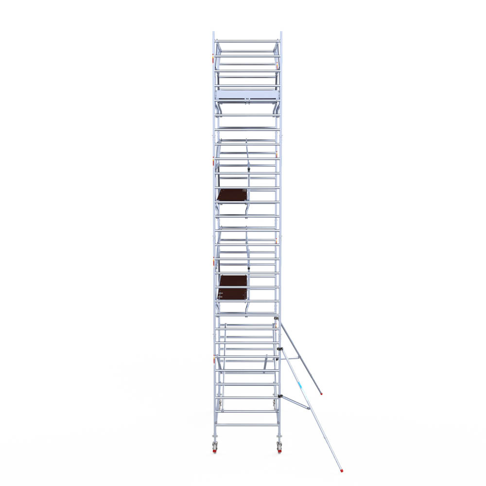 Deze rolsteiger heeft een steigerbreedte van 135, wat voor stabiliteit en stevigheid zorgt. De platformlengte is 305, wat voldoende werkruimte biedt. De werkhoogte van de rolsteiger is 9,2, waardoor je veilig op de gewenste hoogte kunt werken.