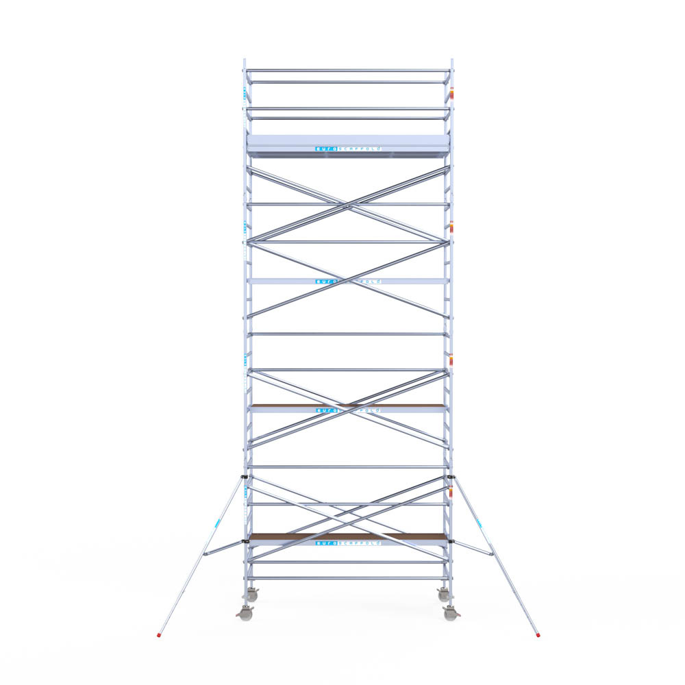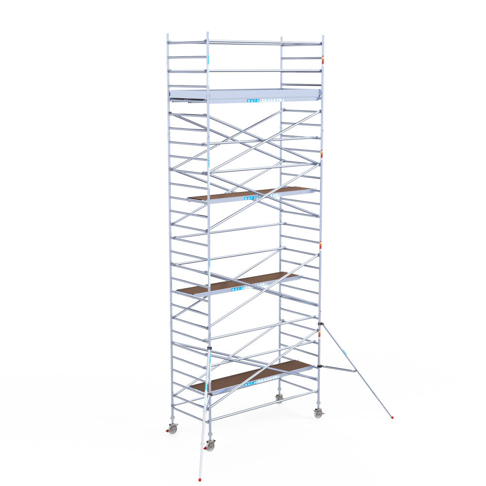Let wel; Door de vernieuwde EN 1004 norm en het A-blad rolsteigers voldoen de Euroscaffold Euro met enkel schoren zonder voorloopleuning niet meer aan de regelgeving voor zakelijk gebruik. De Euro uitvoering met voorloopleuningen voldoen hier wel aan. Voor particulier gebruik is de uitvoering met schoren wel voldoende.