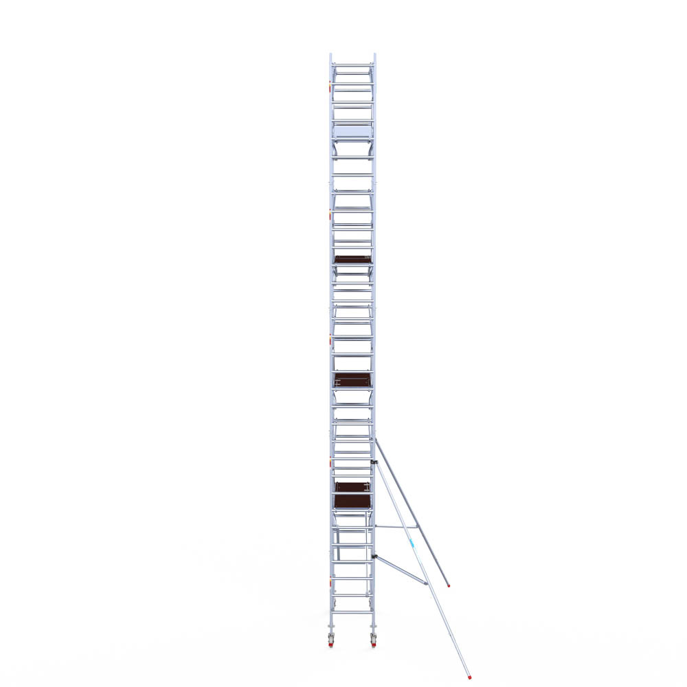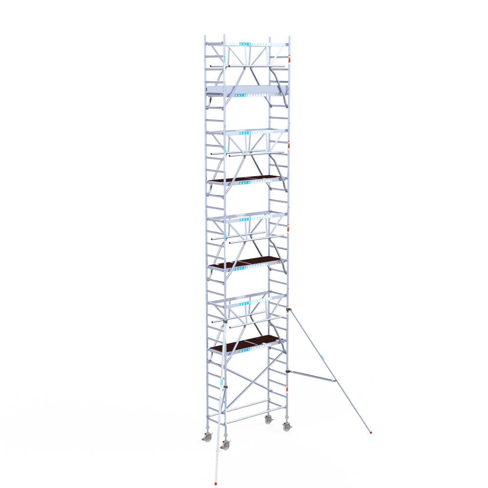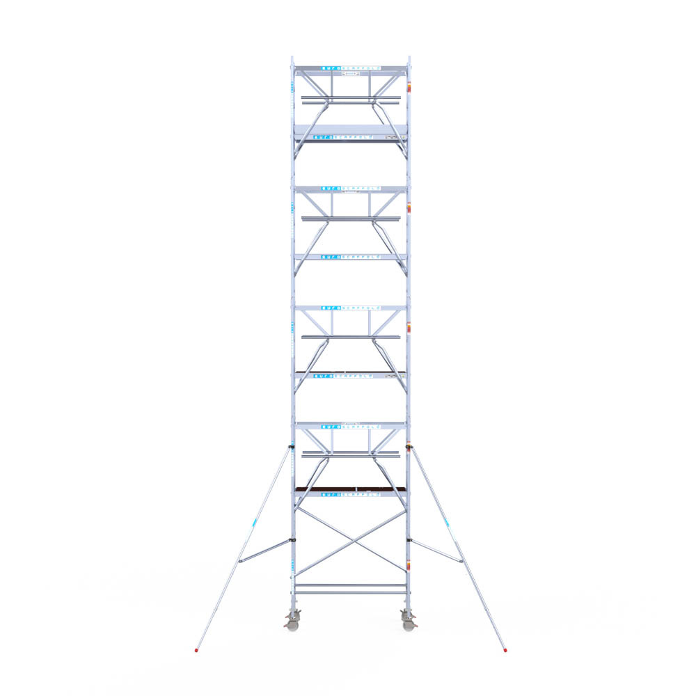 Deze rolsteiger heeft een steigerbreedte van 75, wat voor stabiliteit en stevigheid zorgt. De platformlengte is 190, wat voldoende werkruimte biedt. De werkhoogte van de rolsteiger is 10,2, waardoor je veilig op de gewenste hoogte kunt werken.
