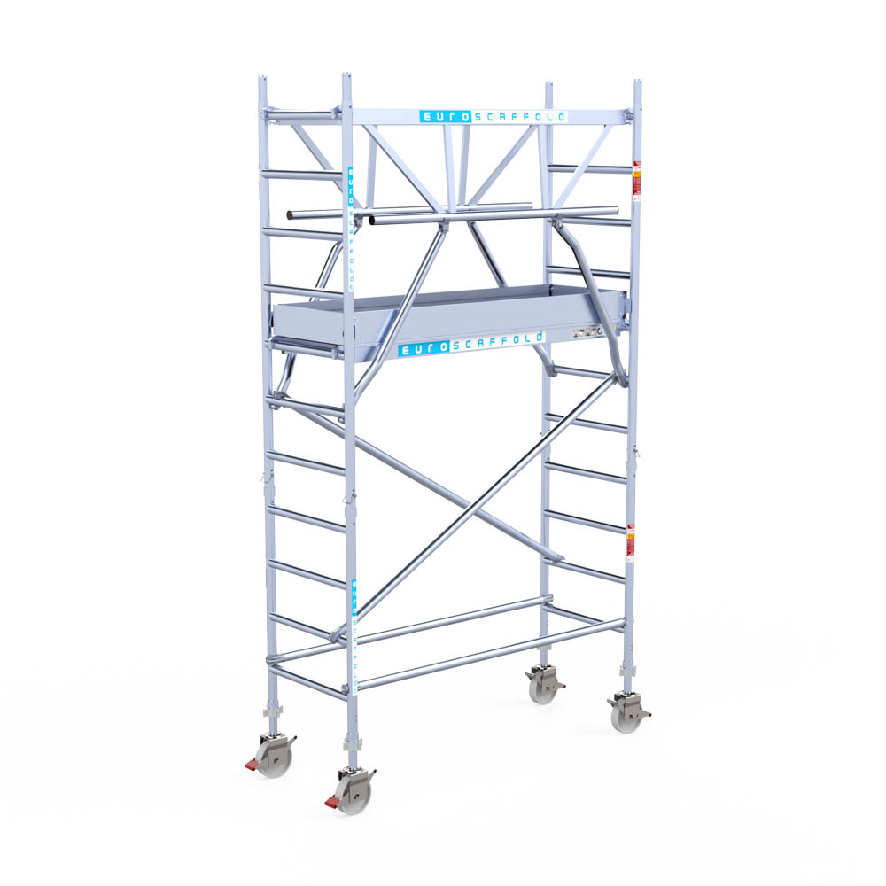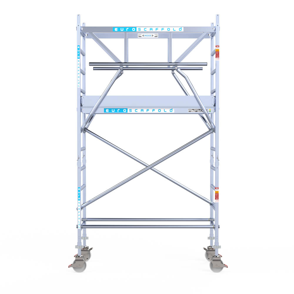Let wel; Door de vernieuwde EN 1004 norm en het A-blad rolsteigers voldoen de Euroscaffold Euro met enkel schoren zonder voorloopleuning niet meer aan de regelgeving voor zakelijk gebruik. De Euro uitvoering met voorloopleuningen voldoen hier wel aan. Voor particulier gebruik is de uitvoering met schoren wel voldoende.
