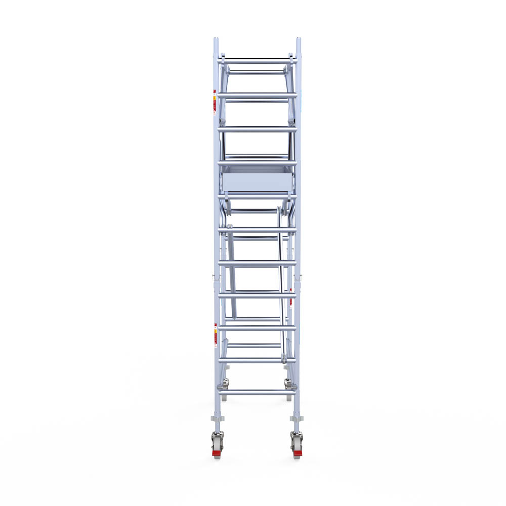 Deze rolsteiger heeft een steigerbreedte van 75, wat voor stabiliteit en stevigheid zorgt. De platformlengte is 190, wat voldoende werkruimte biedt. De werkhoogte van de rolsteiger is 4,2, waardoor je veilig op de gewenste hoogte kunt werken.