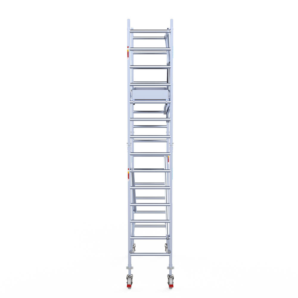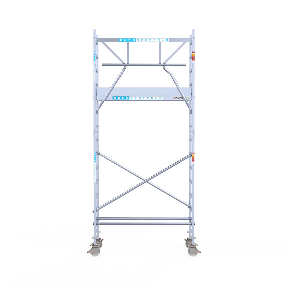 Let wel; Door de vernieuwde EN 1004 norm en het A-blad rolsteigers voldoen de Euroscaffold Euro met enkel schoren zonder voorloopleuning niet meer aan de regelgeving voor zakelijk gebruik. De Euro uitvoering met voorloopleuningen voldoen hier wel aan. Voor particulier gebruik is de uitvoering met schoren wel voldoende.
