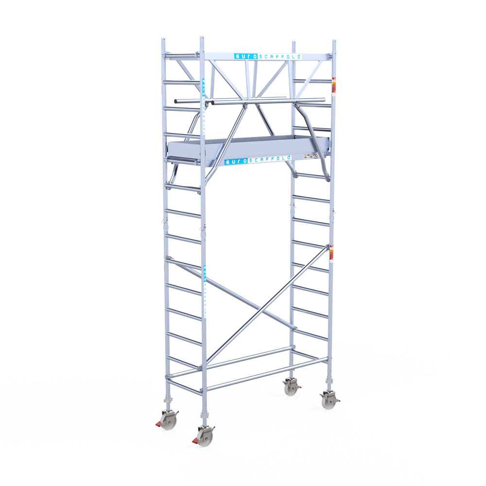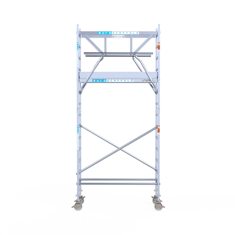Let wel; Door de vernieuwde EN 1004 norm en het A-blad rolsteigers voldoen de Euroscaffold Euro met enkel schoren zonder voorloopleuning niet meer aan de regelgeving voor zakelijk gebruik. De Euro uitvoering met voorloopleuningen voldoen hier wel aan. Voor particulier gebruik is de uitvoering met schoren wel voldoende.