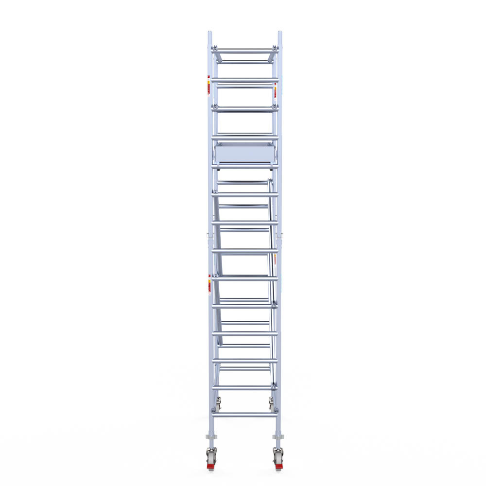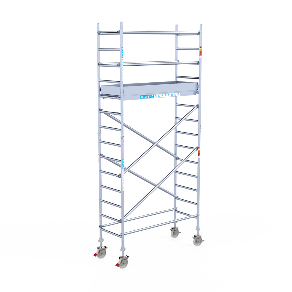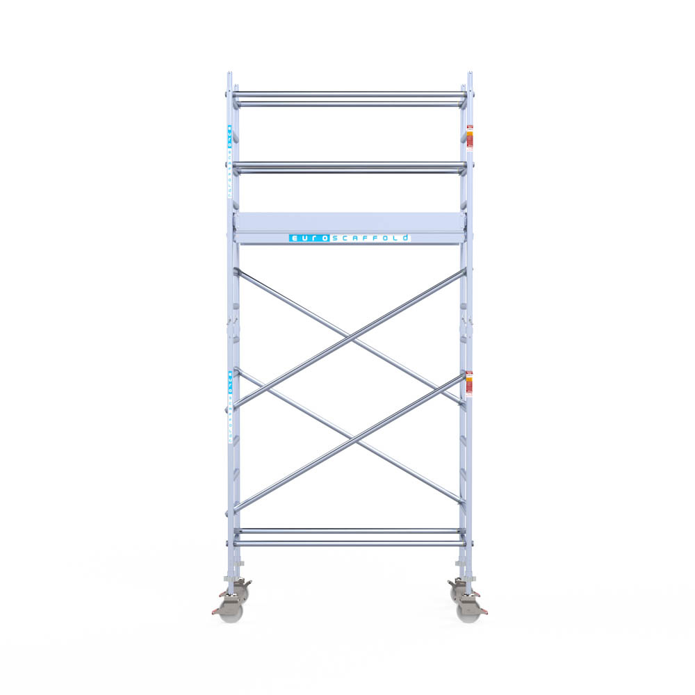 Let wel; Door de vernieuwde EN 1004 norm en het A-blad rolsteigers voldoen de Euroscaffold Euro met enkel schoren zonder voorloopleuning niet meer aan de regelgeving voor zakelijk gebruik. De Euro uitvoering met voorloopleuningen voldoen hier wel aan. Voor particulier gebruik is de uitvoering met schoren wel voldoende.