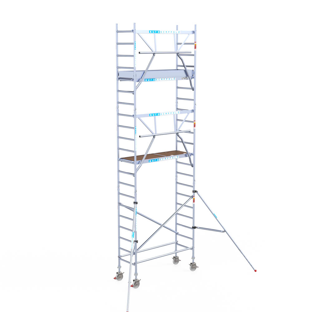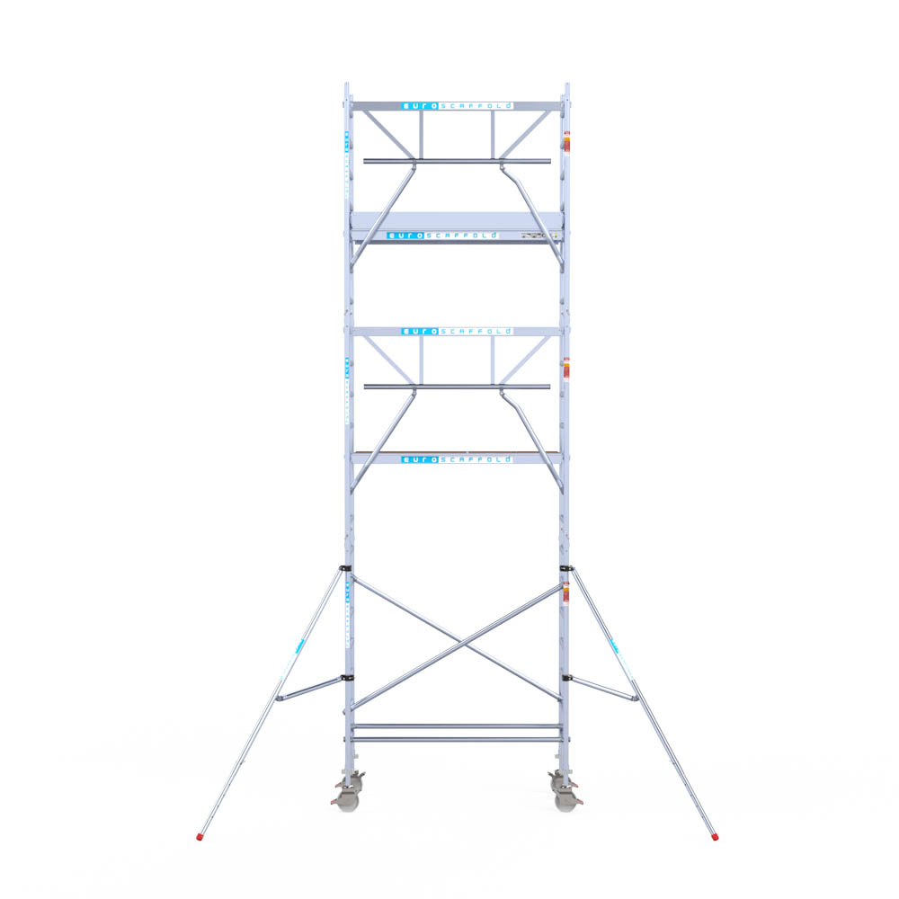 Let wel; Door de vernieuwde EN 1004 norm en het A-blad rolsteigers voldoen de Euroscaffold Euro met enkel schoren zonder voorloopleuning niet meer aan de regelgeving voor zakelijk gebruik. De Euro uitvoering met voorloopleuningen voldoen hier wel aan. Voor particulier gebruik is de uitvoering met schoren wel voldoende.