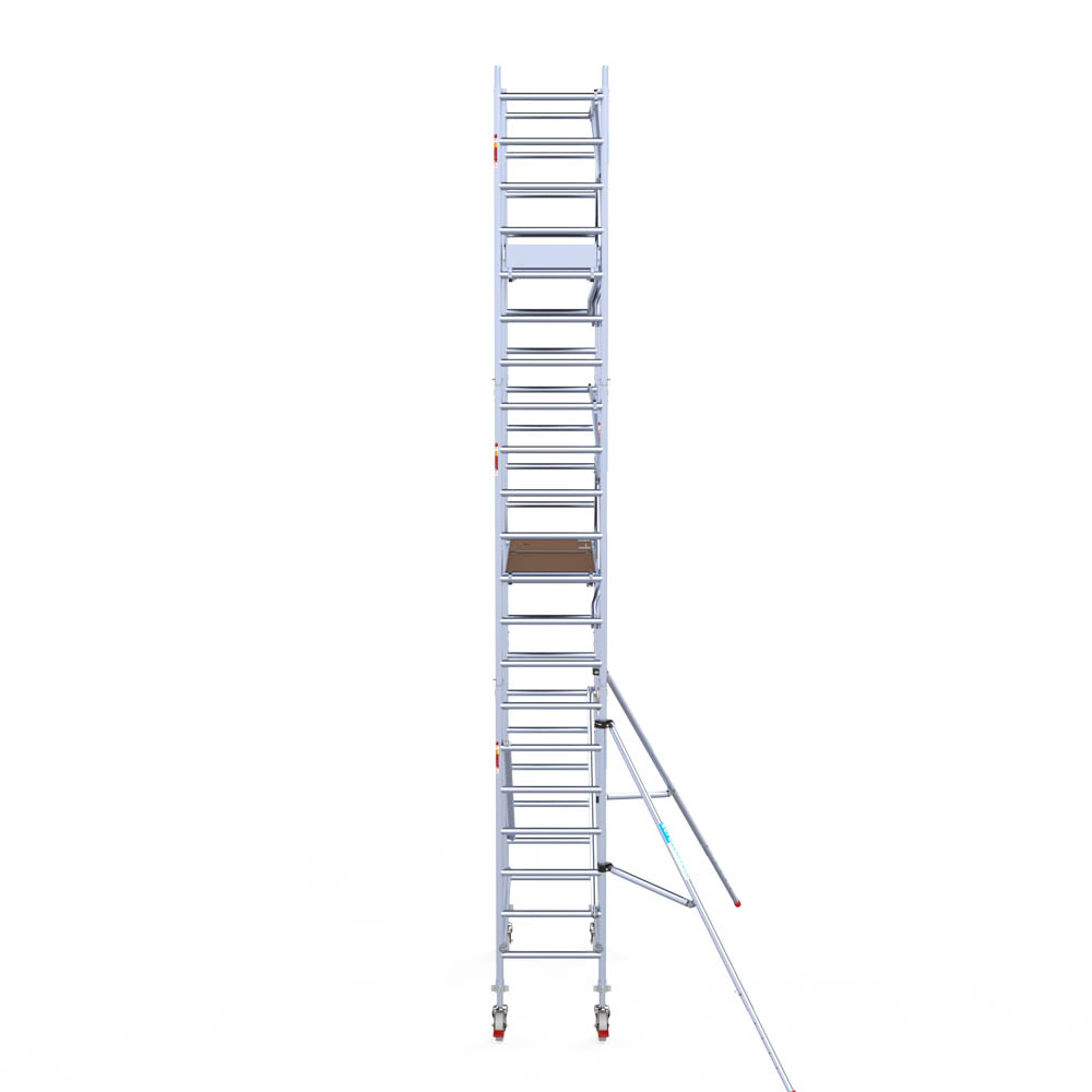 Deze rolsteiger heeft een steigerbreedte van 75, wat voor stabiliteit en stevigheid zorgt. De platformlengte is 190, wat voldoende werkruimte biedt. De werkhoogte van de rolsteiger is 7,2, waardoor je veilig op de gewenste hoogte kunt werken.