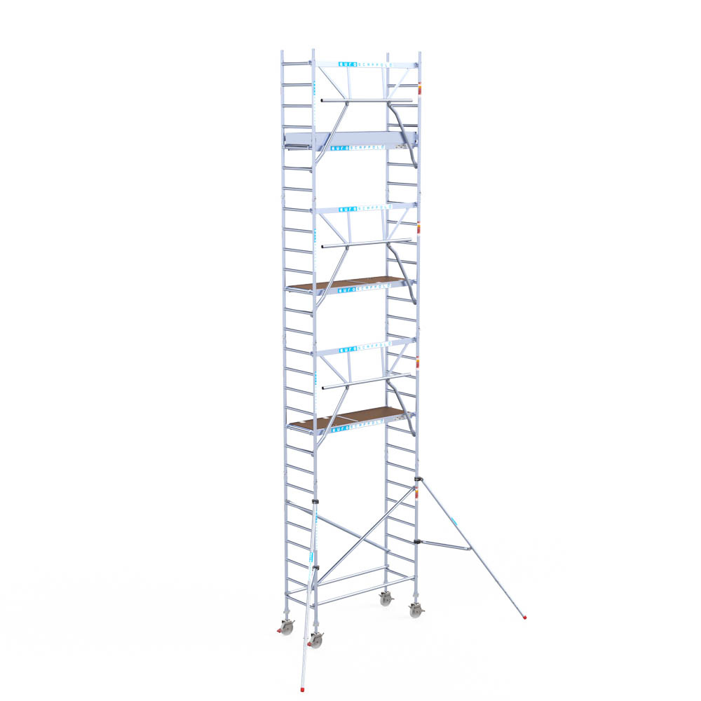 Deze rolsteiger heeft een steigerbreedte van 75, wat voor stabiliteit en stevigheid zorgt. De platformlengte is 190, wat voldoende werkruimte biedt. De werkhoogte van de rolsteiger is 9,2, waardoor je veilig op de gewenste hoogte kunt werken.