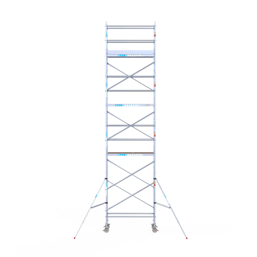 Let wel; Door de vernieuwde EN 1004 norm en het A-blad rolsteigers voldoen de Euroscaffold Euro met enkel schoren zonder voorloopleuning niet meer aan de regelgeving voor zakelijk gebruik. De Euro uitvoering met voorloopleuningen voldoen hier wel aan. Voor particulier gebruik is de uitvoering met schoren wel voldoende.