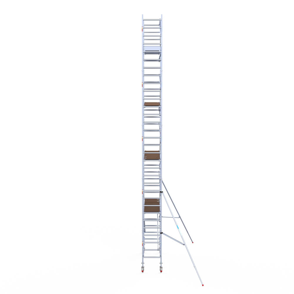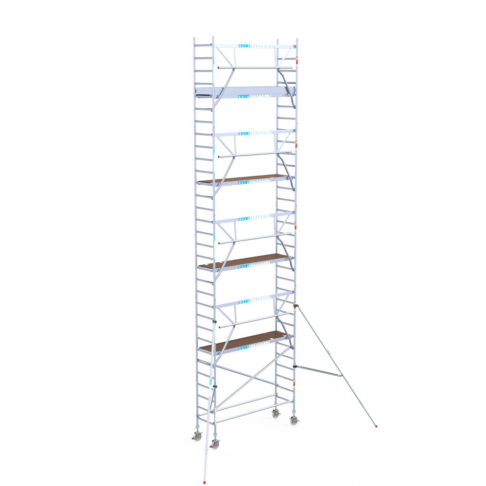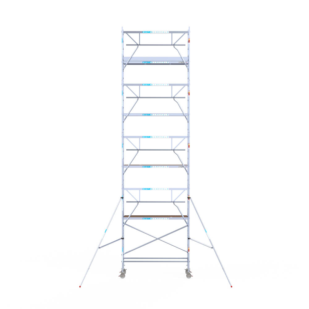 Deze rolsteiger heeft een steigerbreedte van 75, wat voor stabiliteit en stevigheid zorgt. De platformlengte is 250, wat voldoende werkruimte biedt. De werkhoogte van de rolsteiger is 10,2, waardoor je veilig op de gewenste hoogte kunt werken.