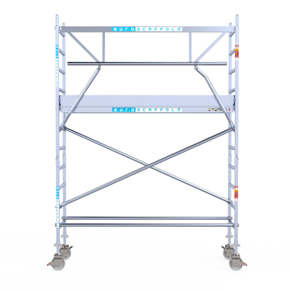 Let wel; Door de vernieuwde EN 1004 norm en het A-blad rolsteigers voldoen de Euroscaffold Euro met enkel schoren zonder voorloopleuning niet meer aan de regelgeving voor zakelijk gebruik. De Euro uitvoering met voorloopleuningen voldoen hier wel aan. Voor particulier gebruik is de uitvoering met schoren wel voldoende.
