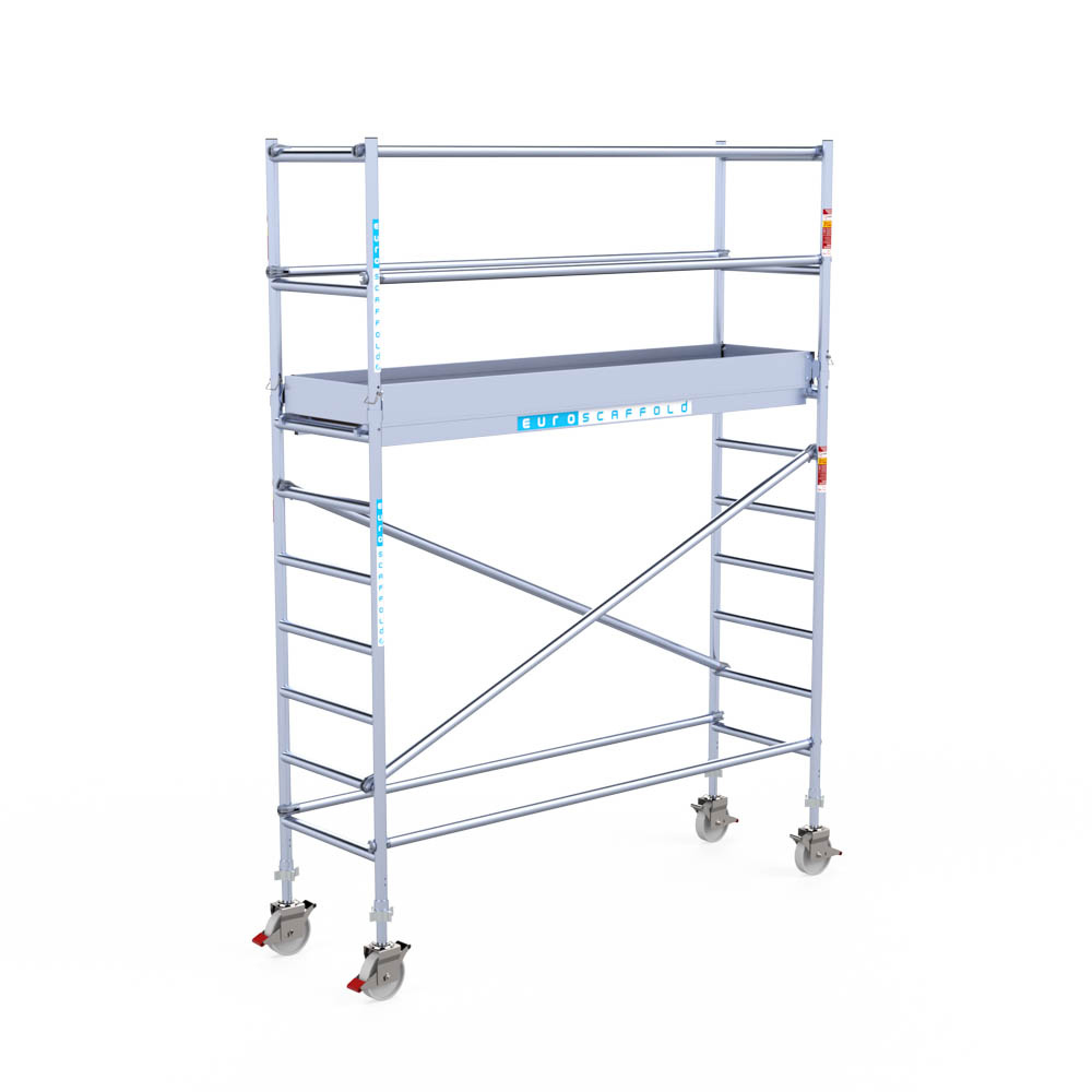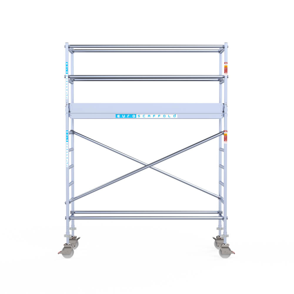 Let wel; Door de vernieuwde EN 1004 norm en het A-blad rolsteigers voldoen de Euroscaffold Euro met enkel schoren zonder voorloopleuning niet meer aan de regelgeving voor zakelijk gebruik. De Euro uitvoering met voorloopleuningen voldoen hier wel aan. Voor particulier gebruik is de uitvoering met schoren wel voldoende.