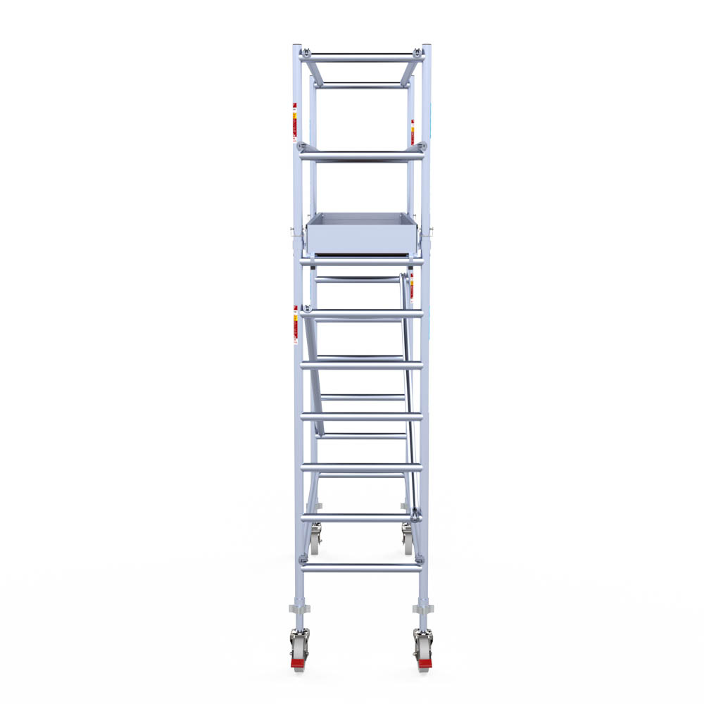 Deze rolsteiger heeft een steigerbreedte van 75, wat voor stabiliteit en stevigheid zorgt. De platformlengte is 250, wat voldoende werkruimte biedt. De werkhoogte van de rolsteiger is 4,2, waardoor je veilig op de gewenste hoogte kunt werken.