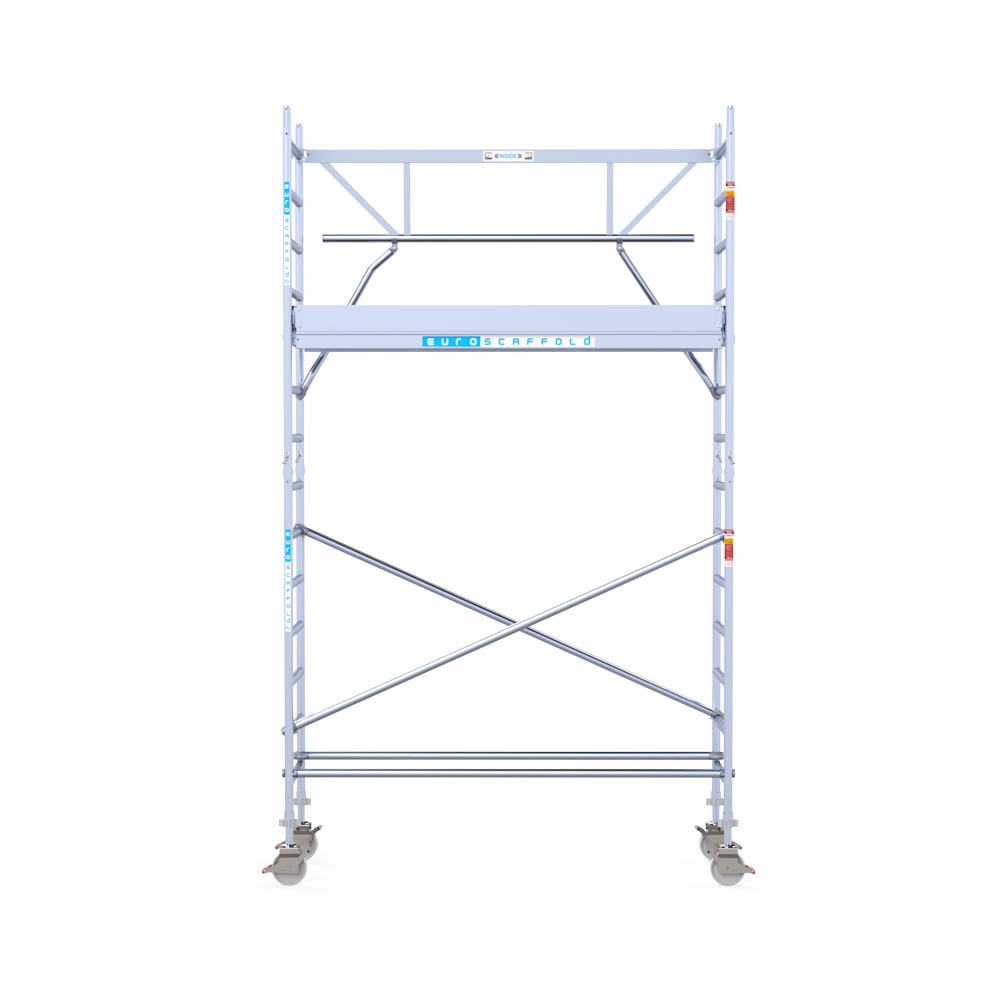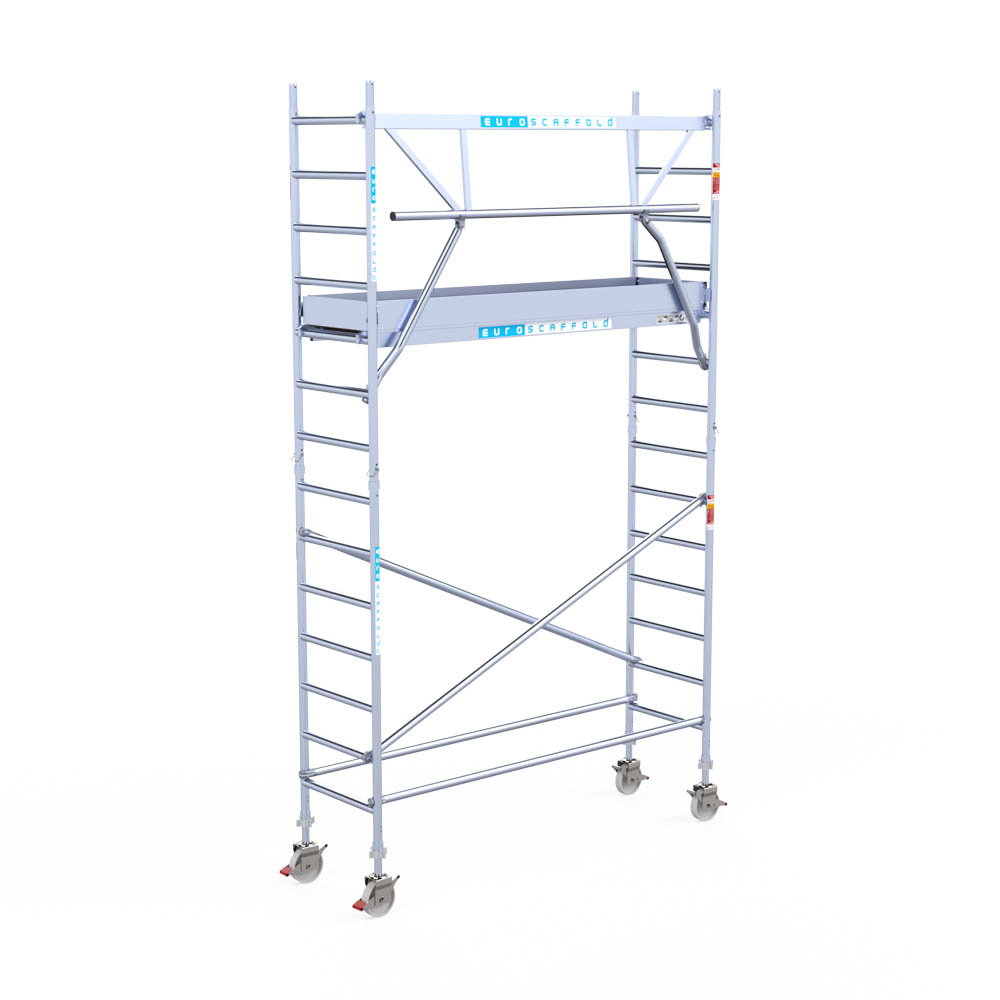 Let wel; Door de vernieuwde EN 1004 norm en het A-blad rolsteigers voldoen de Euroscaffold Euro met enkel schoren zonder voorloopleuning niet meer aan de regelgeving voor zakelijk gebruik. De Euro uitvoering met voorloopleuningen voldoen hier wel aan. Voor particulier gebruik is de uitvoering met schoren wel voldoende.