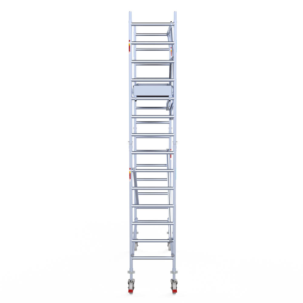 Deze rolsteiger heeft een steigerbreedte van 75, wat voor stabiliteit en stevigheid zorgt. De platformlengte is 250, wat voldoende werkruimte biedt. De werkhoogte van de rolsteiger is 5,2, waardoor je veilig op de gewenste hoogte kunt werken.