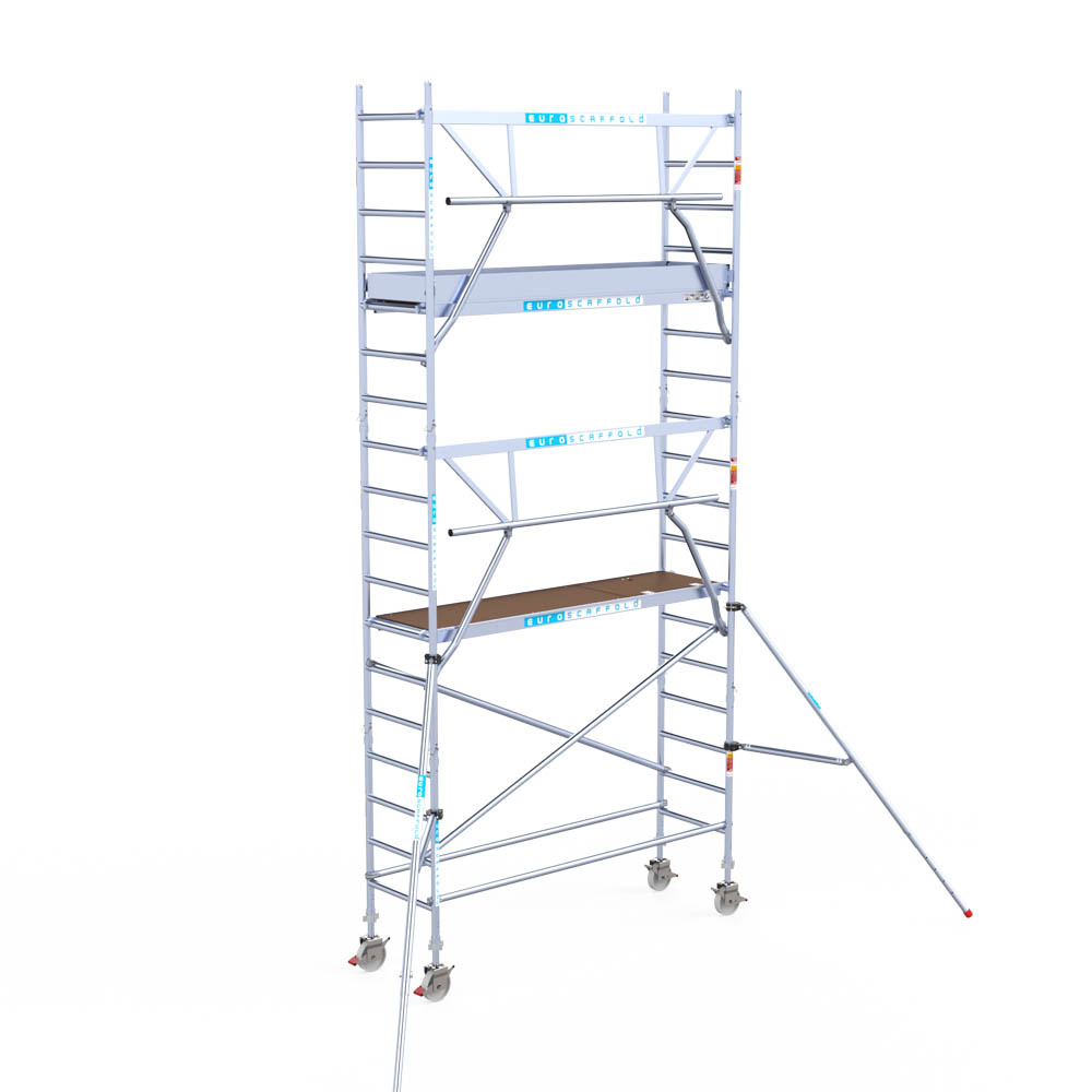 Let wel; Door de vernieuwde EN 1004 norm en het A-blad rolsteigers voldoen de Euroscaffold Euro met enkel schoren zonder voorloopleuning niet meer aan de regelgeving voor zakelijk gebruik. De Euro uitvoering met voorloopleuningen voldoen hier wel aan. Voor particulier gebruik is de uitvoering met schoren wel voldoende.