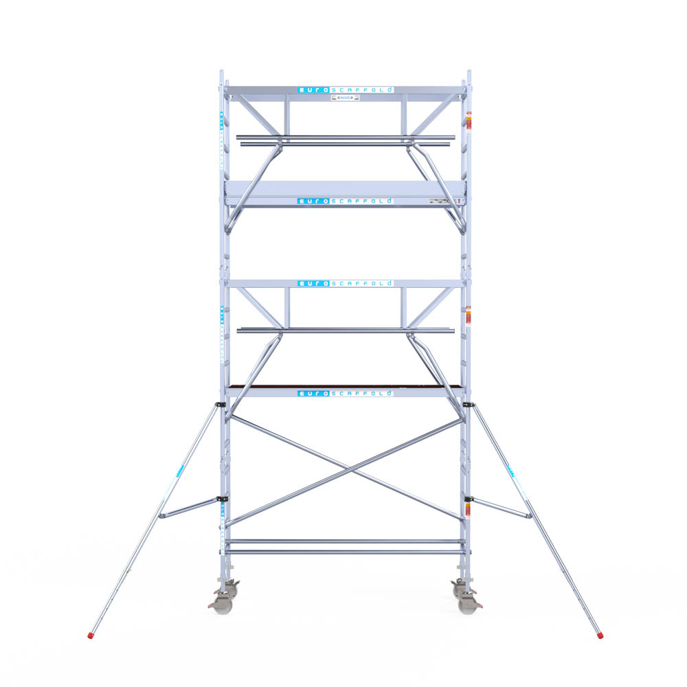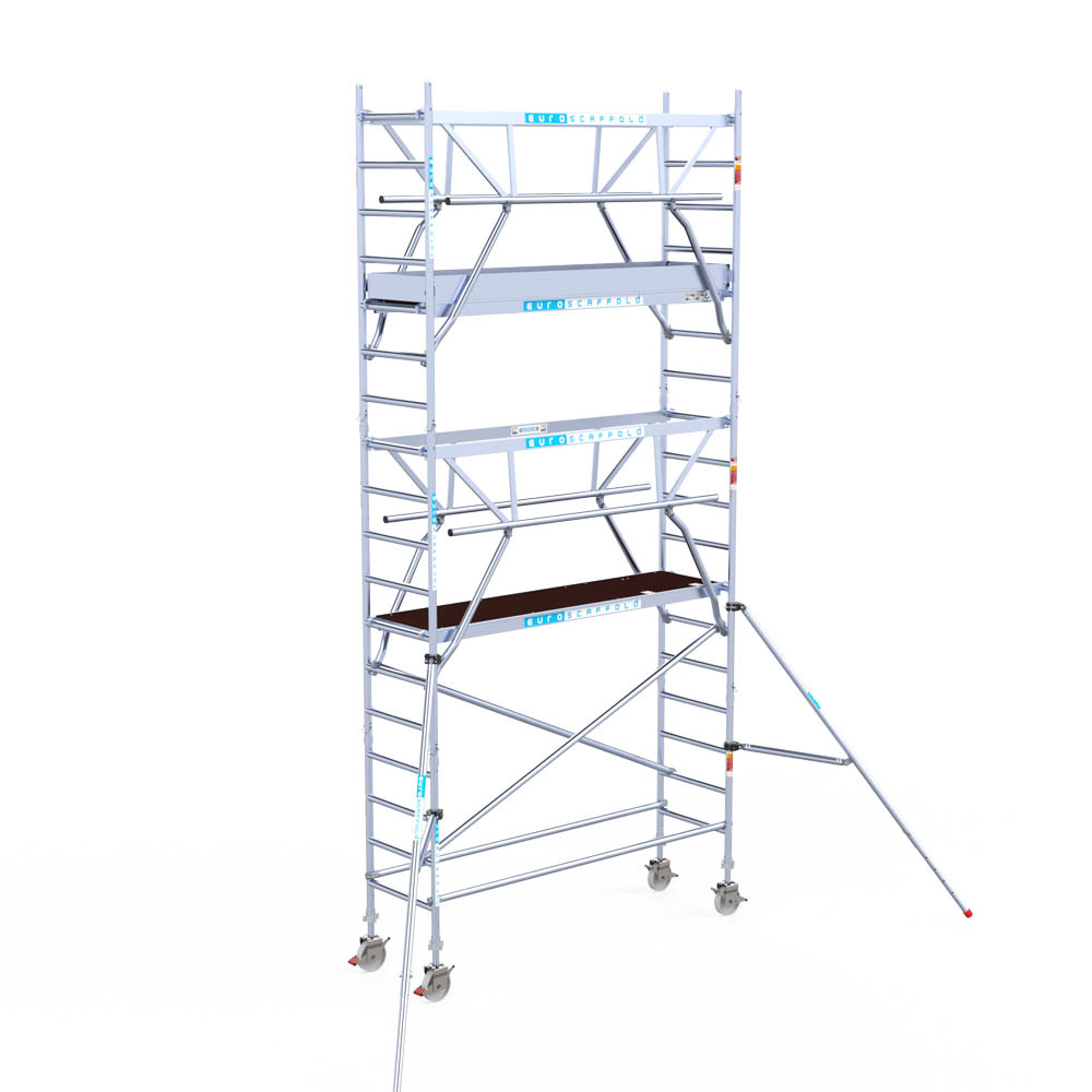 Let wel; Door de vernieuwde EN 1004 norm en het A-blad rolsteigers voldoen de Euroscaffold Euro met enkel schoren zonder voorloopleuning niet meer aan de regelgeving voor zakelijk gebruik. De Euro uitvoering met voorloopleuningen voldoen hier wel aan. Voor particulier gebruik is de uitvoering met schoren wel voldoende.