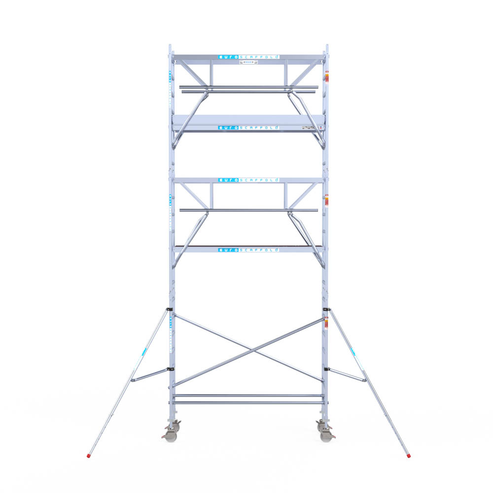Let wel; Door de vernieuwde EN 1004 norm en het A-blad rolsteigers voldoen de Euroscaffold Euro met enkel schoren zonder voorloopleuning niet meer aan de regelgeving voor zakelijk gebruik. De Euro uitvoering met voorloopleuningen voldoen hier wel aan. Voor particulier gebruik is de uitvoering met schoren wel voldoende.