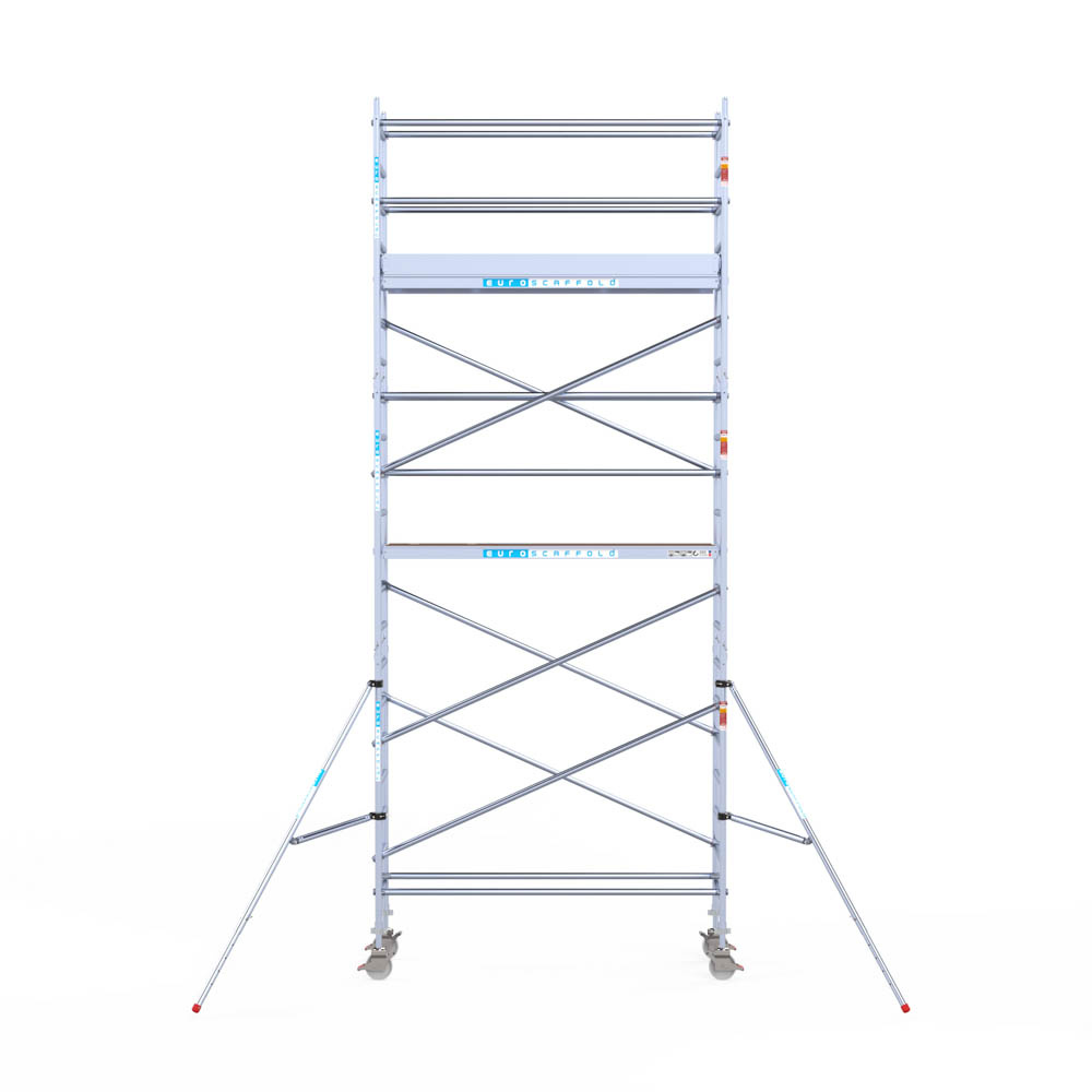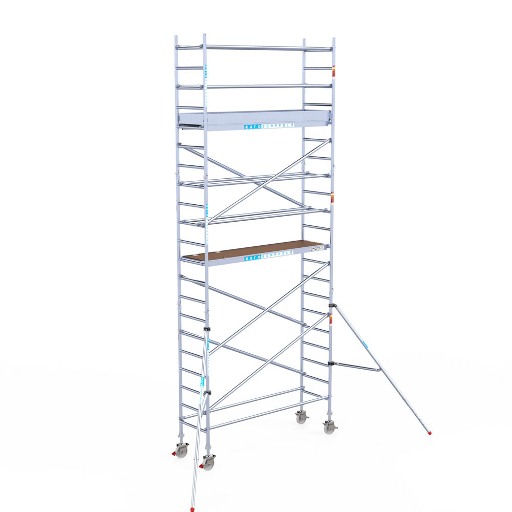 Let wel; Door de vernieuwde EN 1004 norm en het A-blad rolsteigers voldoen de Euroscaffold Euro met enkel schoren zonder voorloopleuning niet meer aan de regelgeving voor zakelijk gebruik. De Euro uitvoering met voorloopleuningen voldoen hier wel aan. Voor particulier gebruik is de uitvoering met schoren wel voldoende.