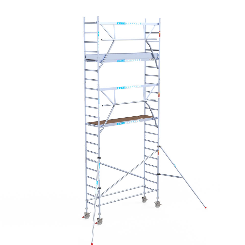 Let wel; Door de vernieuwde EN 1004 norm en het A-blad rolsteigers voldoen de Euroscaffold Euro met enkel schoren zonder voorloopleuning niet meer aan de regelgeving voor zakelijk gebruik. De Euro uitvoering met voorloopleuningen voldoen hier wel aan. Voor particulier gebruik is de uitvoering met schoren wel voldoende.