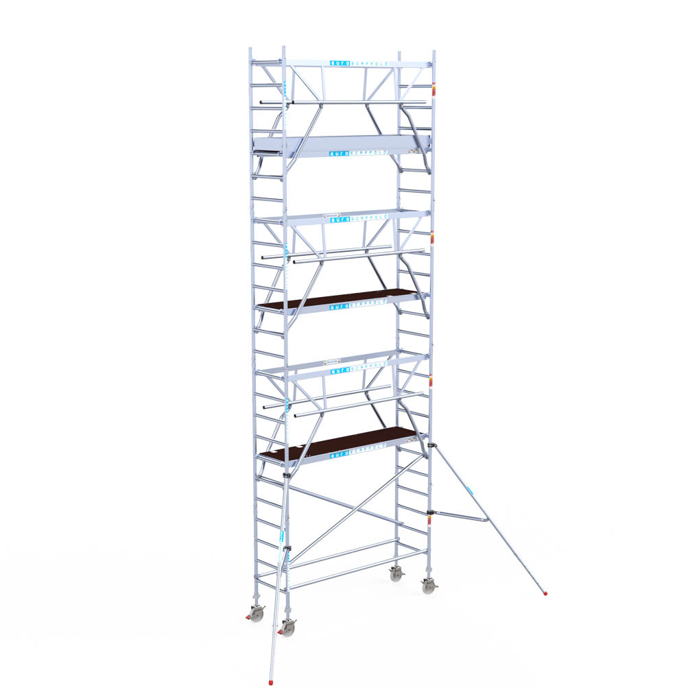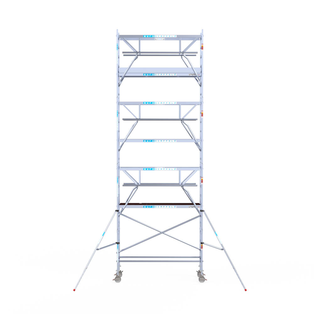 Let wel; Door de vernieuwde EN 1004 norm en het A-blad rolsteigers voldoen de Euroscaffold Euro met enkel schoren zonder voorloopleuning niet meer aan de regelgeving voor zakelijk gebruik. De Euro uitvoering met voorloopleuningen voldoen hier wel aan. Voor particulier gebruik is de uitvoering met schoren wel voldoende.