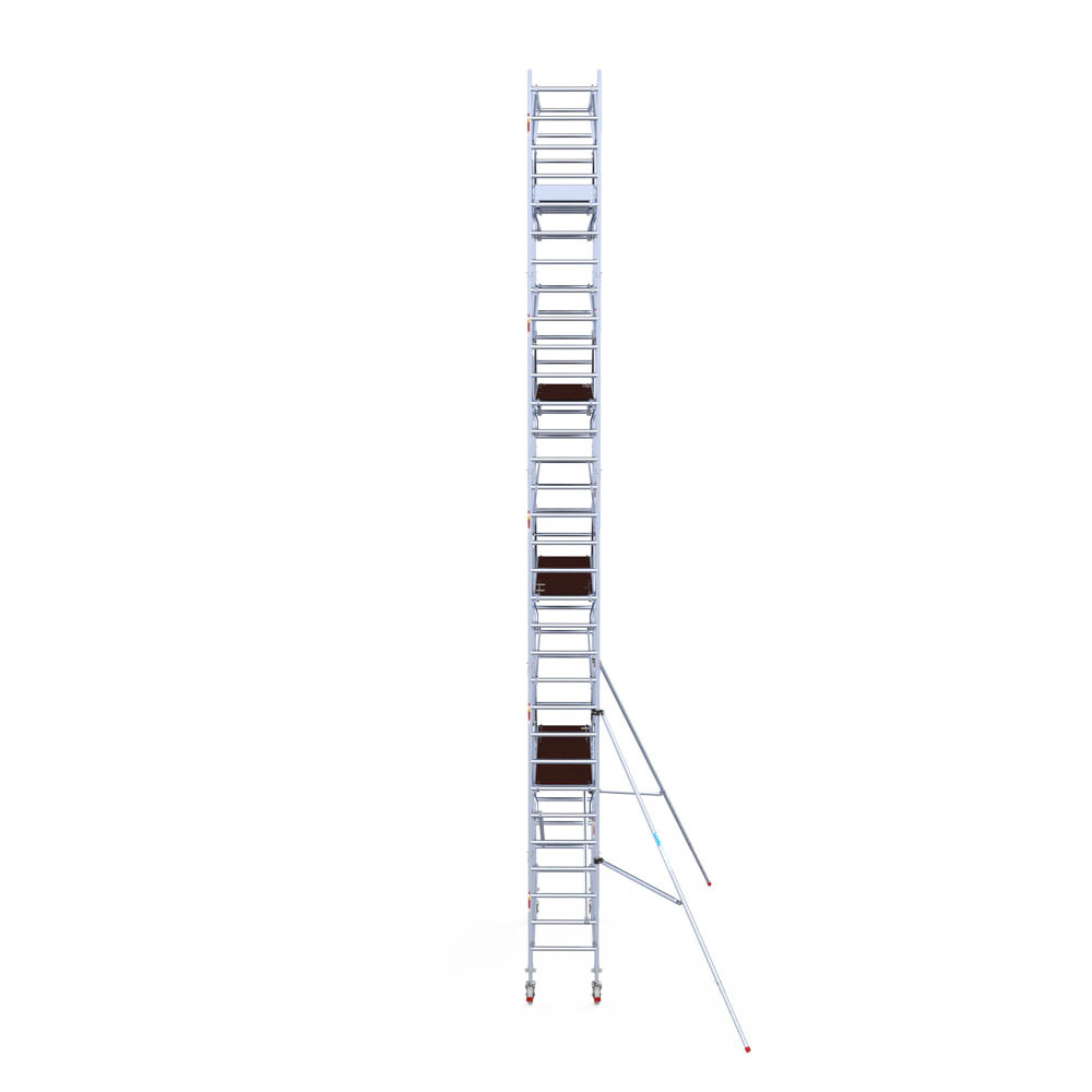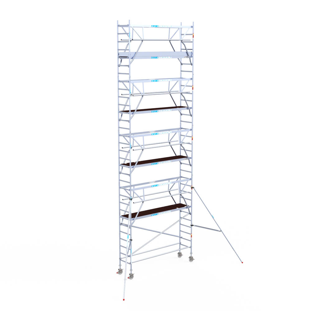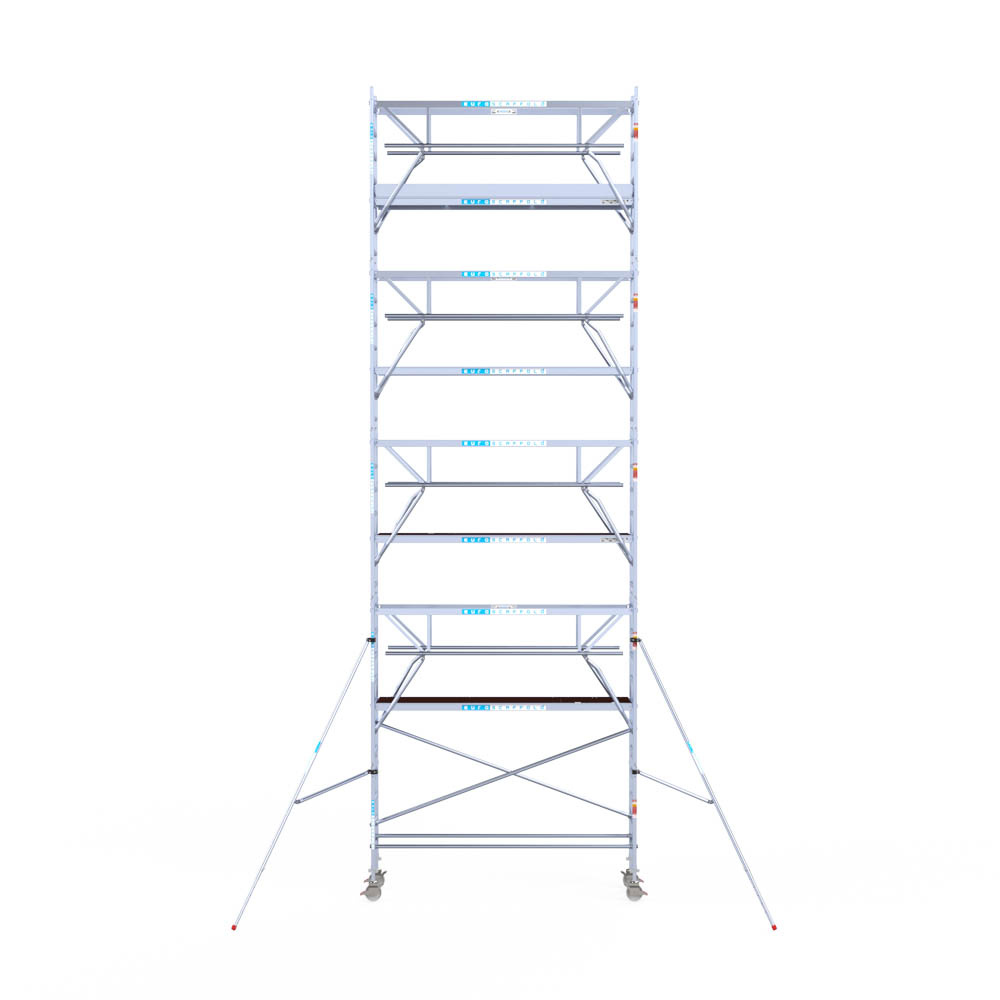 Let wel; Door de vernieuwde EN 1004 norm en het A-blad rolsteigers voldoen de Euroscaffold Euro met enkel schoren zonder voorloopleuning niet meer aan de regelgeving voor zakelijk gebruik. De Euro uitvoering met voorloopleuningen voldoen hier wel aan. Voor particulier gebruik is de uitvoering met schoren wel voldoende.