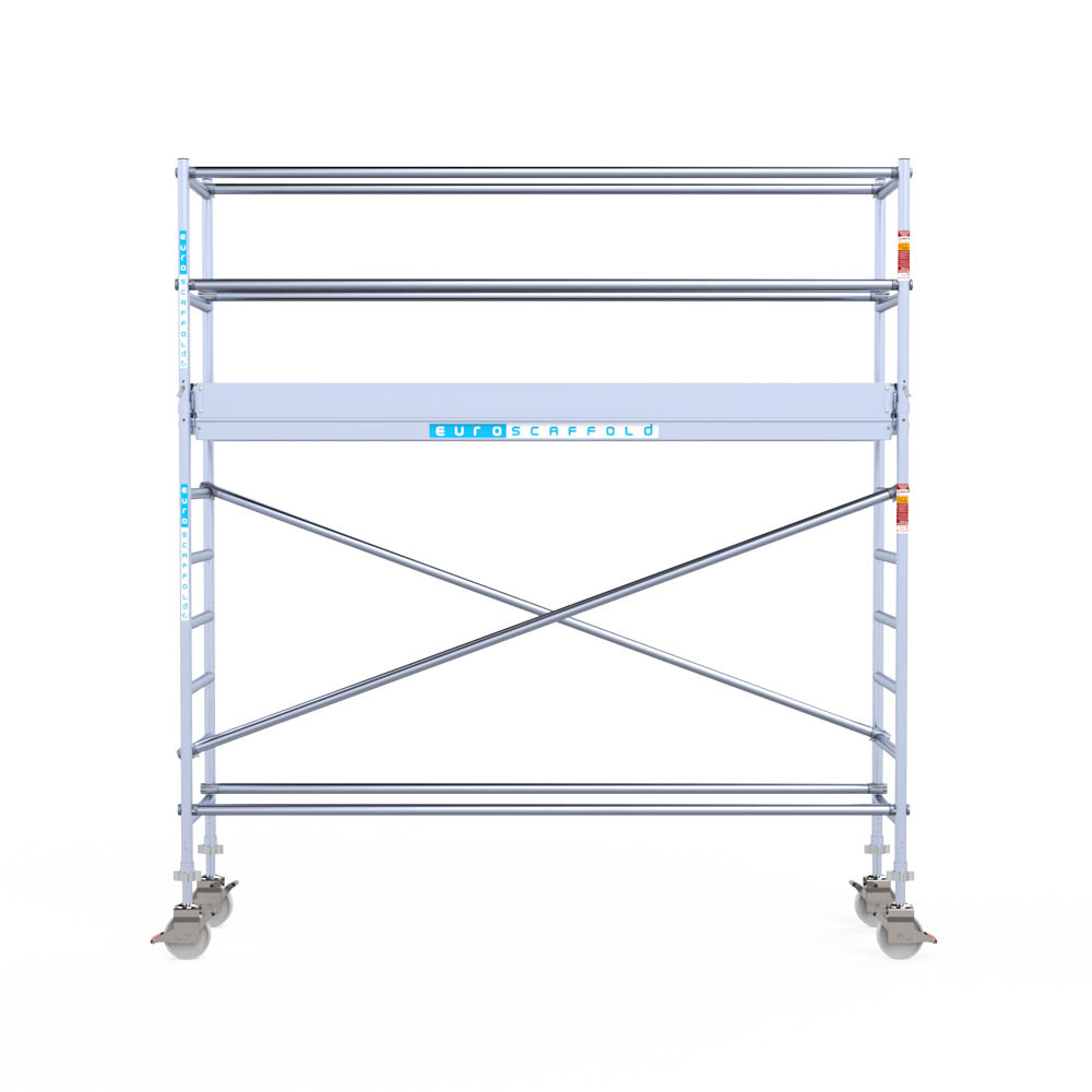 Let wel; Door de vernieuwde EN 1004 norm en het A-blad rolsteigers voldoen de Euroscaffold Euro met enkel schoren zonder voorloopleuning niet meer aan de regelgeving voor zakelijk gebruik. De Euro uitvoering met voorloopleuningen voldoen hier wel aan. Voor particulier gebruik is de uitvoering met schoren wel voldoende.