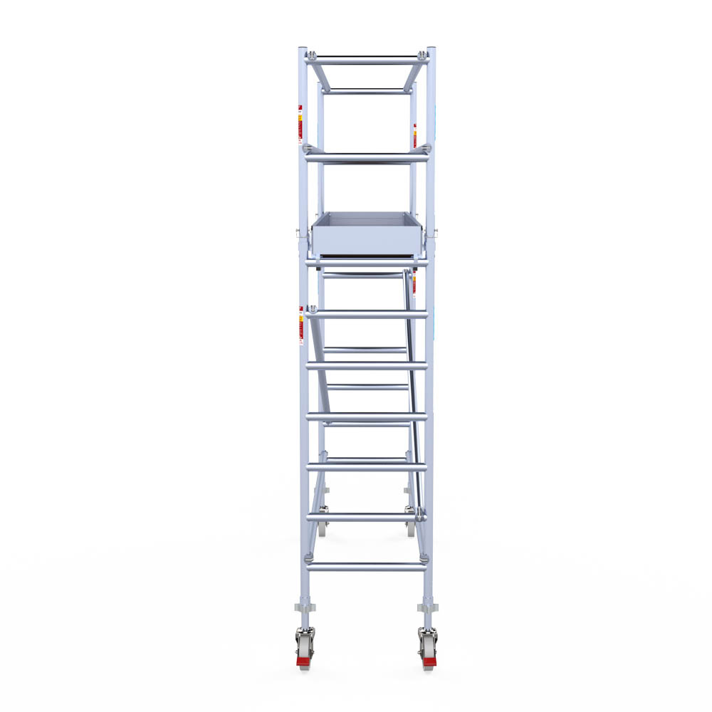 Deze rolsteiger heeft een steigerbreedte van 75, wat voor stabiliteit en stevigheid zorgt. De platformlengte is 305, wat voldoende werkruimte biedt. De werkhoogte van de rolsteiger is 4,2, waardoor je veilig op de gewenste hoogte kunt werken.