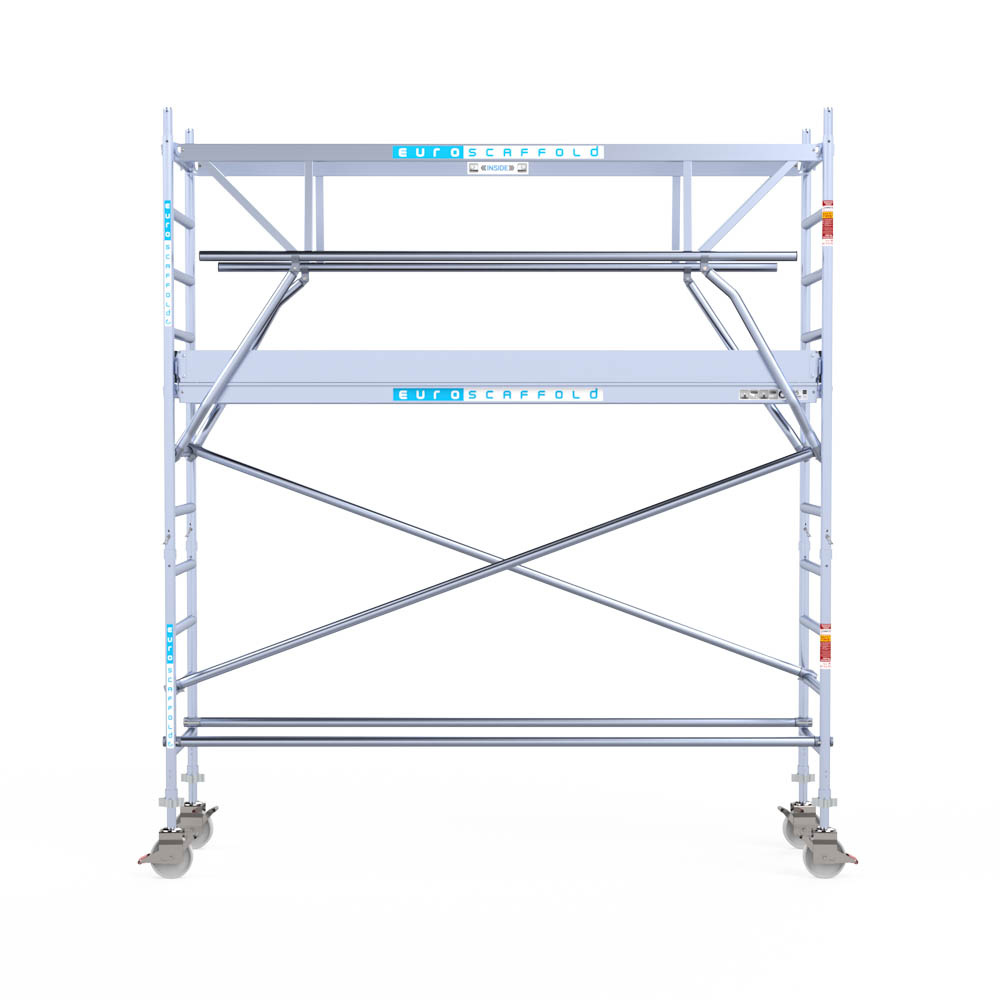 Let wel; Door de vernieuwde EN 1004 norm en het A-blad rolsteigers voldoen de Euroscaffold Euro met enkel schoren zonder voorloopleuning niet meer aan de regelgeving voor zakelijk gebruik. De Euro uitvoering met voorloopleuningen voldoen hier wel aan. Voor particulier gebruik is de uitvoering met schoren wel voldoende.