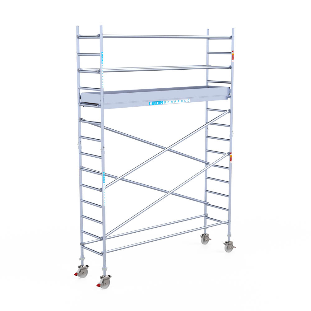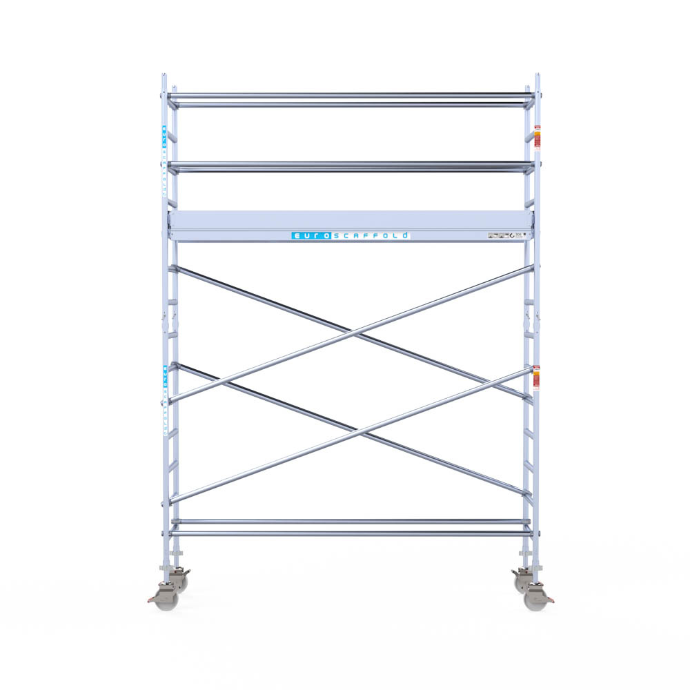 Let wel; Door de vernieuwde EN 1004 norm en het A-blad rolsteigers voldoen de Euroscaffold Euro met enkel schoren zonder voorloopleuning niet meer aan de regelgeving voor zakelijk gebruik. De Euro uitvoering met voorloopleuningen voldoen hier wel aan. Voor particulier gebruik is de uitvoering met schoren wel voldoende.