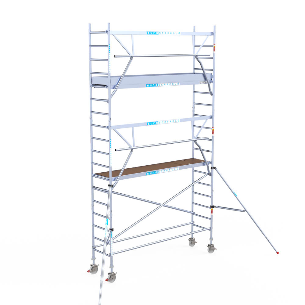 Let wel; Door de vernieuwde EN 1004 norm en het A-blad rolsteigers voldoen de Euroscaffold Euro met enkel schoren zonder voorloopleuning niet meer aan de regelgeving voor zakelijk gebruik. De Euro uitvoering met voorloopleuningen voldoen hier wel aan. Voor particulier gebruik is de uitvoering met schoren wel voldoende.