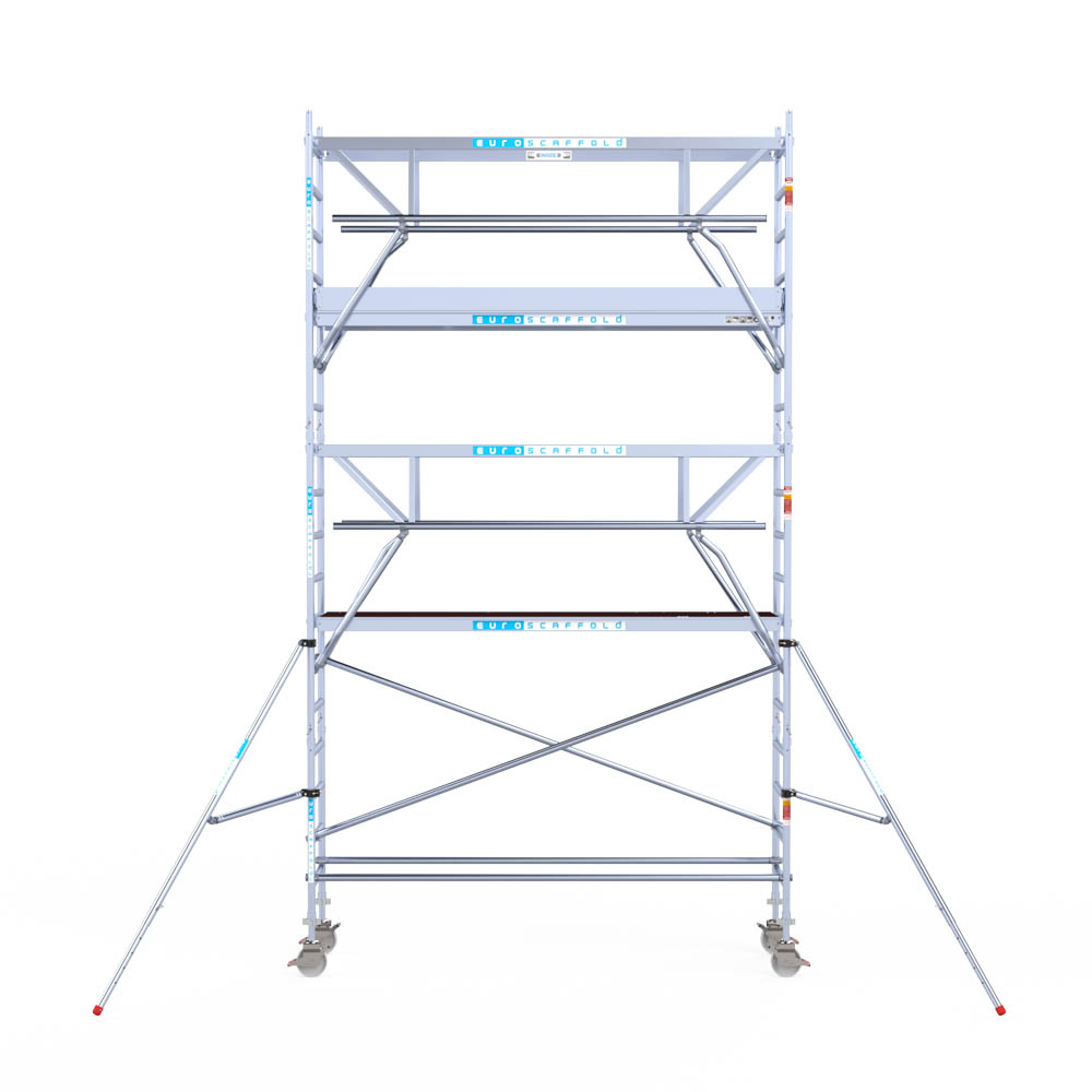 Let wel; Door de vernieuwde EN 1004 norm en het A-blad rolsteigers voldoen de Euroscaffold Euro met enkel schoren zonder voorloopleuning niet meer aan de regelgeving voor zakelijk gebruik. De Euro uitvoering met voorloopleuningen voldoen hier wel aan. Voor particulier gebruik is de uitvoering met schoren wel voldoende.