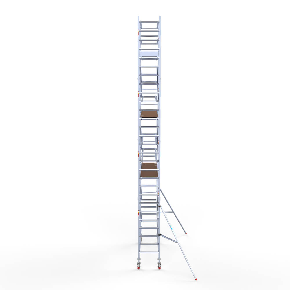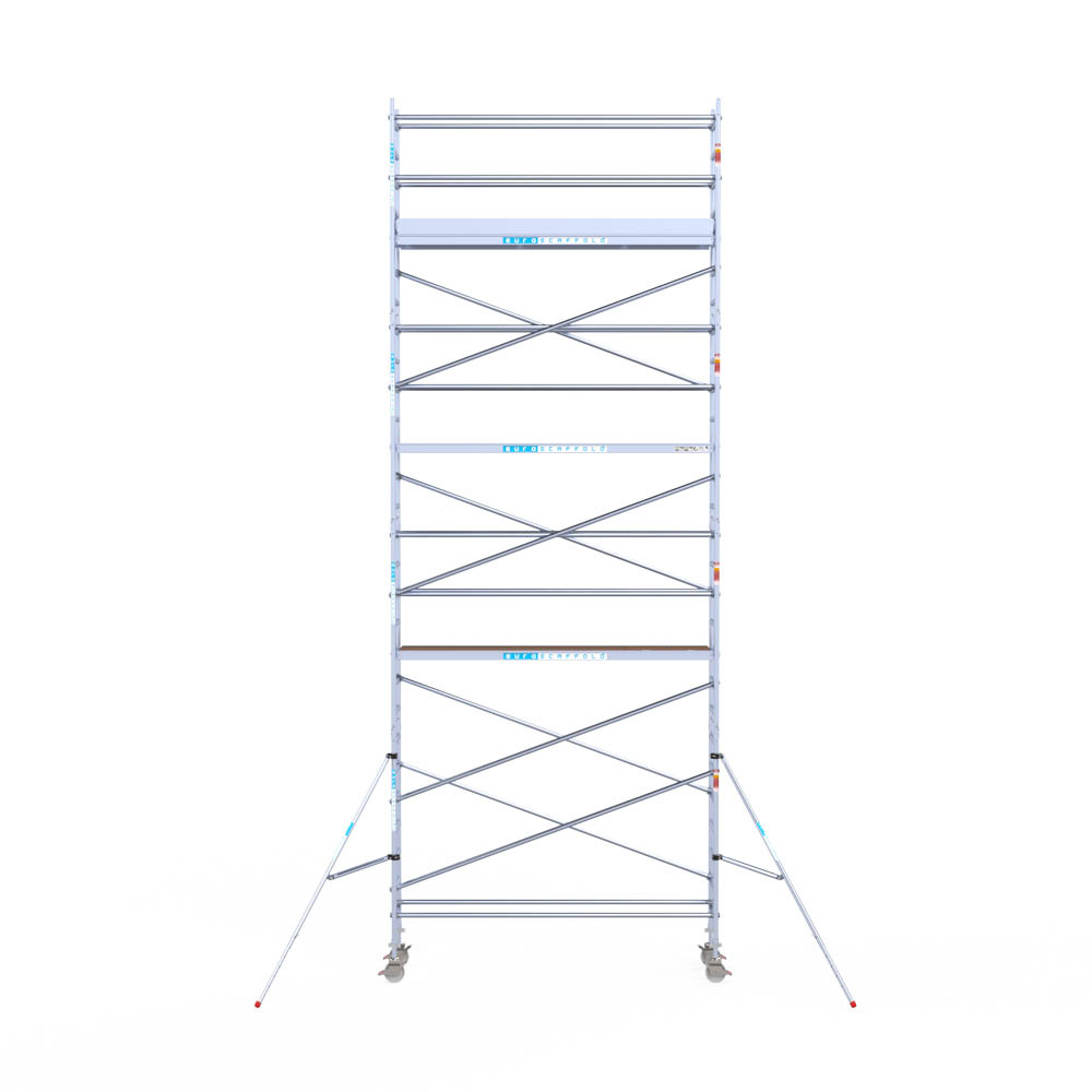 Let wel; Door de vernieuwde EN 1004 norm en het A-blad rolsteigers voldoen de Euroscaffold Euro met enkel schoren zonder voorloopleuning niet meer aan de regelgeving voor zakelijk gebruik. De Euro uitvoering met voorloopleuningen voldoen hier wel aan. Voor particulier gebruik is de uitvoering met schoren wel voldoende.