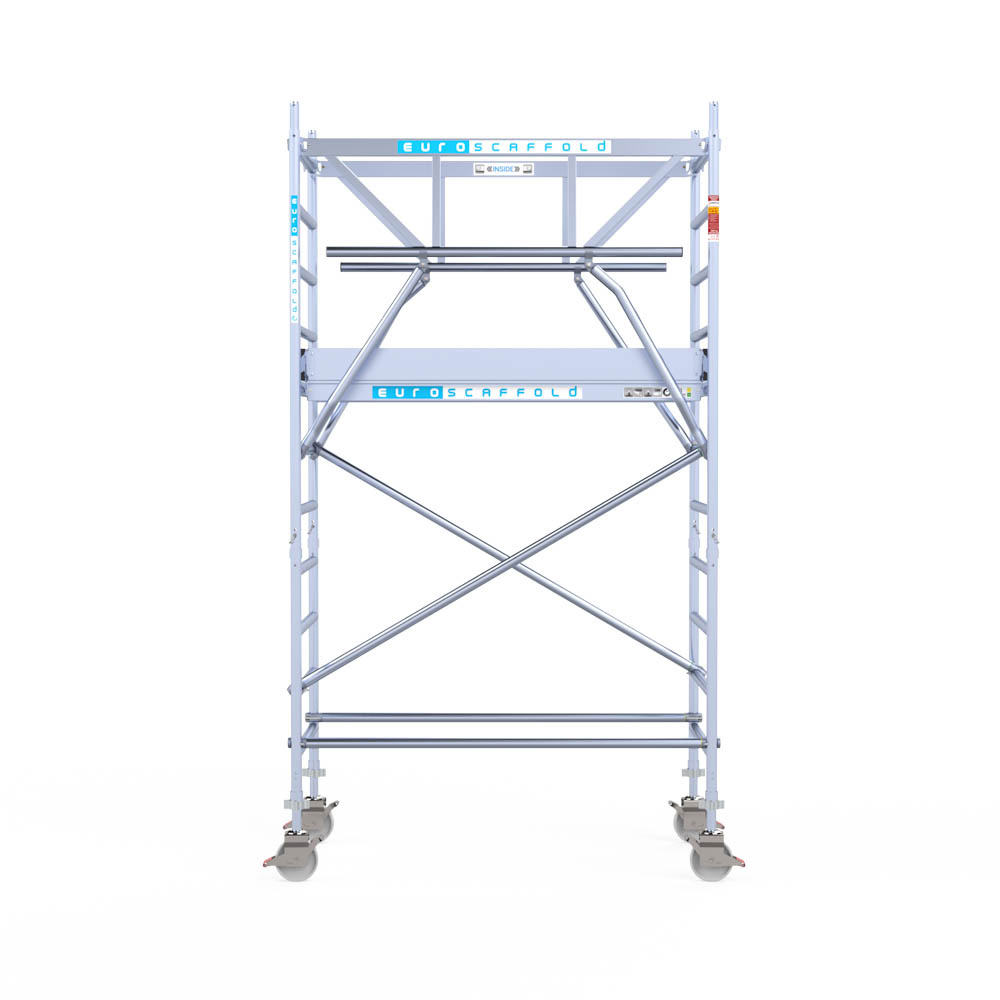 Let wel; Door de vernieuwde EN 1004 norm en het A-blad rolsteigers voldoen de Euroscaffold Euro met enkel schoren zonder voorloopleuning niet meer aan de regelgeving voor zakelijk gebruik. De Euro uitvoering met voorloopleuningen voldoen hier wel aan. Voor particulier gebruik is de uitvoering met schoren wel voldoende.