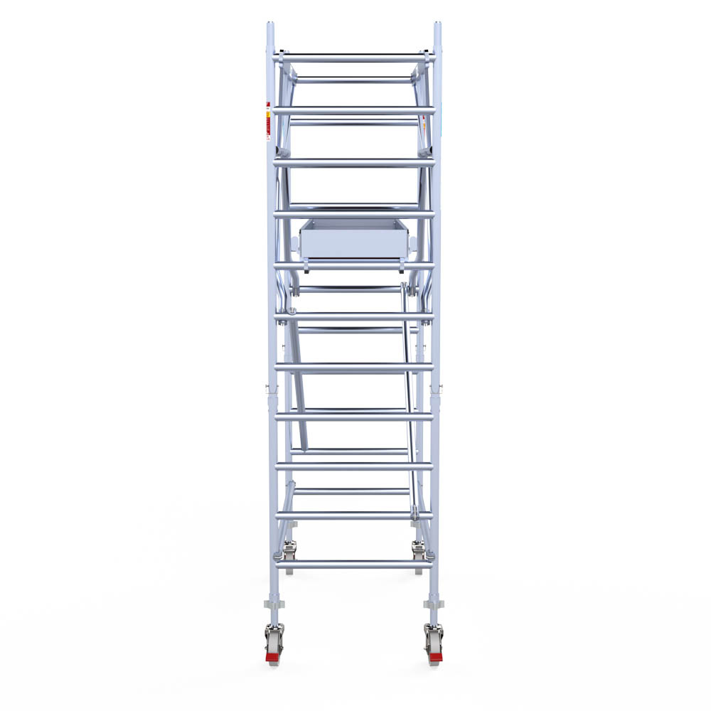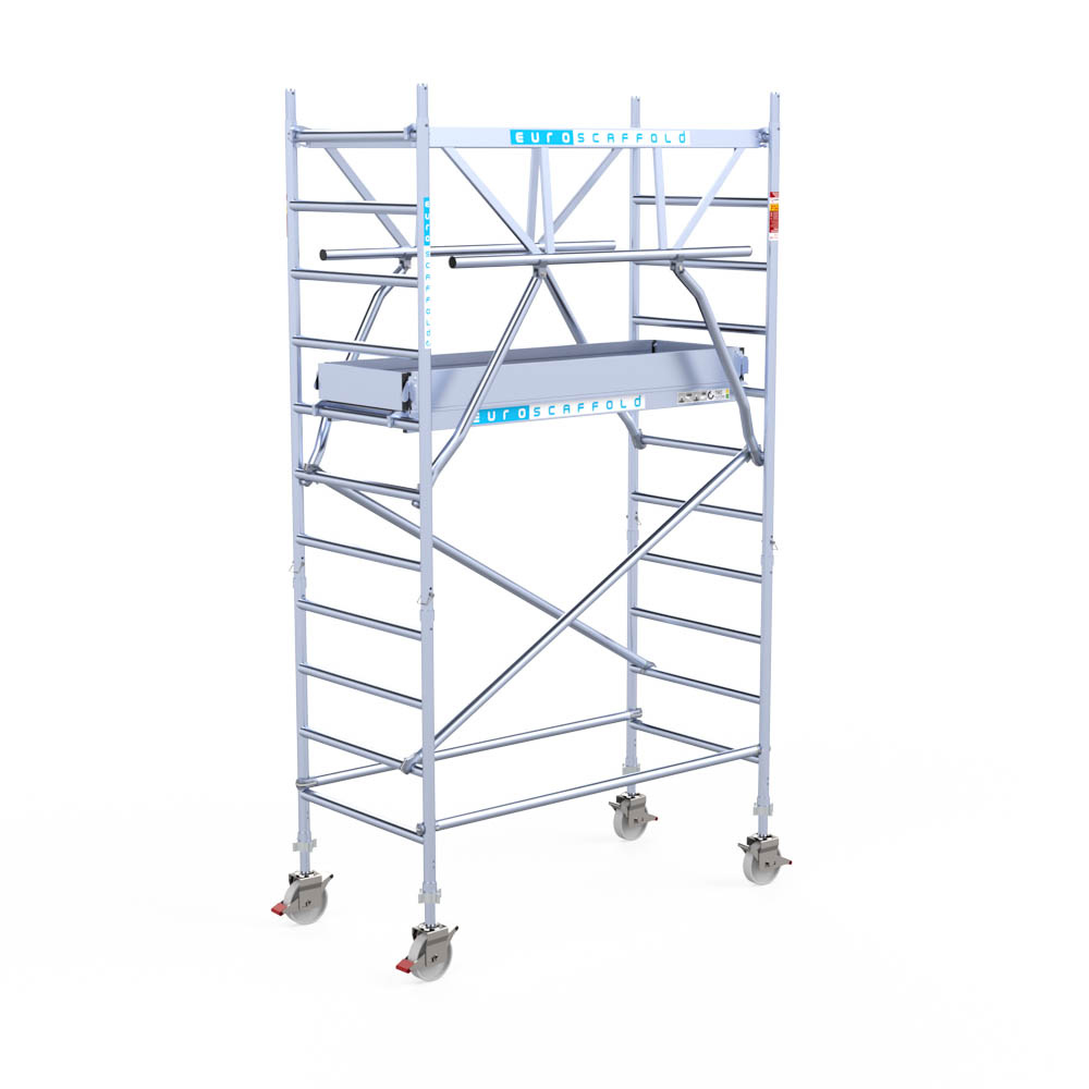 Let wel; Door de vernieuwde EN 1004 norm en het A-blad rolsteigers voldoen de Euroscaffold Euro met enkel schoren zonder voorloopleuning niet meer aan de regelgeving voor zakelijk gebruik. De Euro uitvoering met voorloopleuningen voldoen hier wel aan. Voor particulier gebruik is de uitvoering met schoren wel voldoende.
