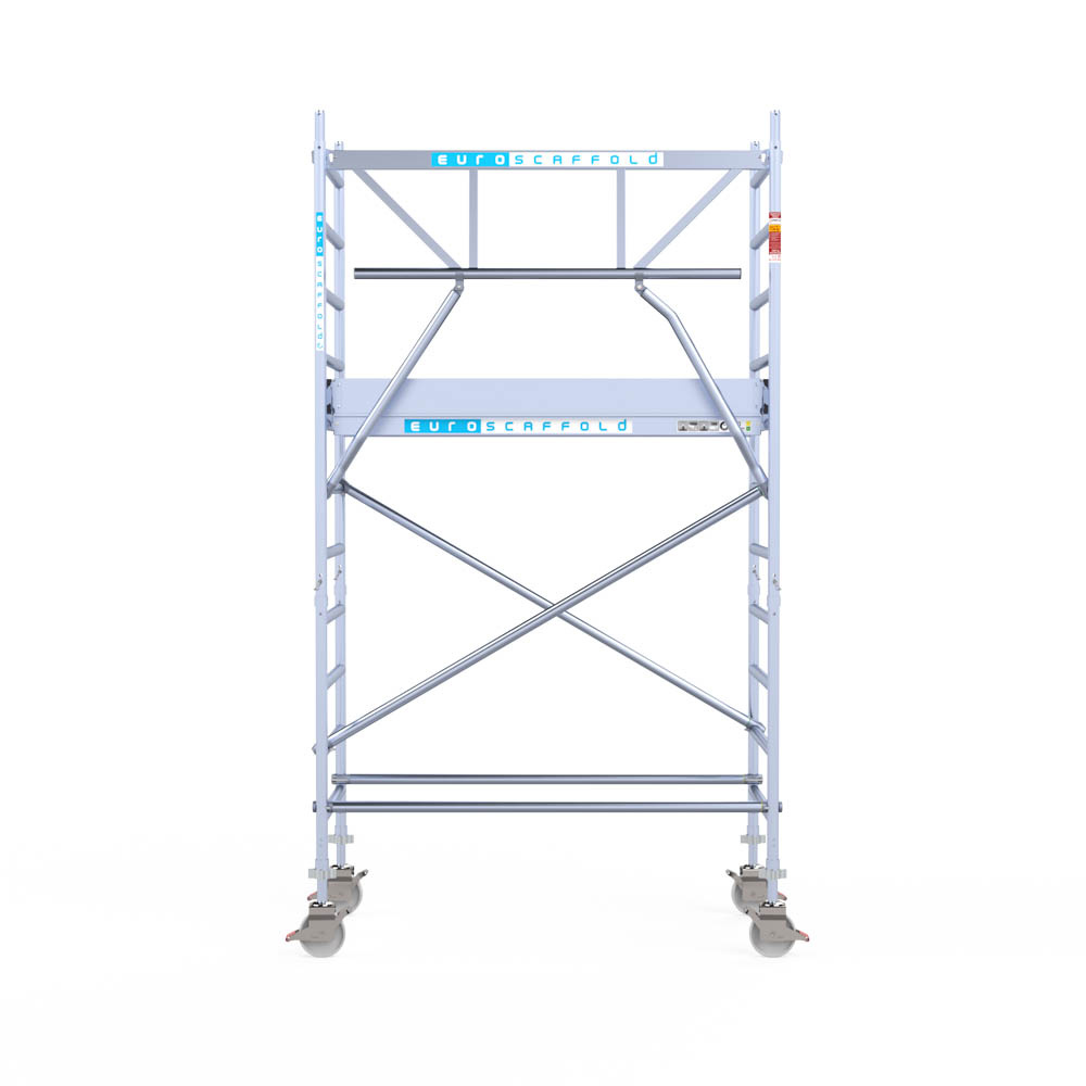 Let wel; Door de vernieuwde EN 1004 norm en het A-blad rolsteigers voldoen de Euroscaffold Euro met enkel schoren zonder voorloopleuning niet meer aan de regelgeving voor zakelijk gebruik. De Euro uitvoering met voorloopleuningen voldoen hier wel aan. Voor particulier gebruik is de uitvoering met schoren wel voldoende.