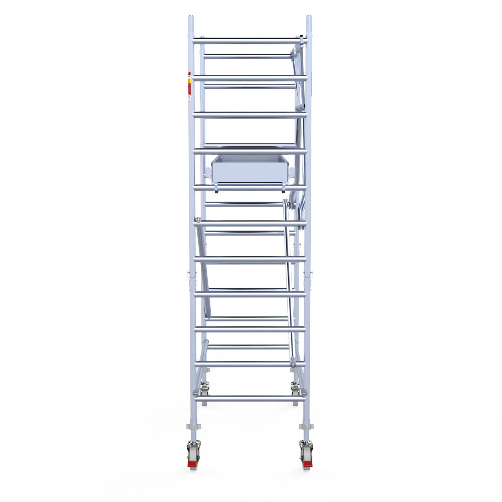 Deze rolsteiger heeft een steigerbreedte van 90, wat voor stabiliteit en stevigheid zorgt. De platformlengte is 190, wat voldoende werkruimte biedt. De werkhoogte van de rolsteiger is 4,2, waardoor je veilig op de gewenste hoogte kunt werken.