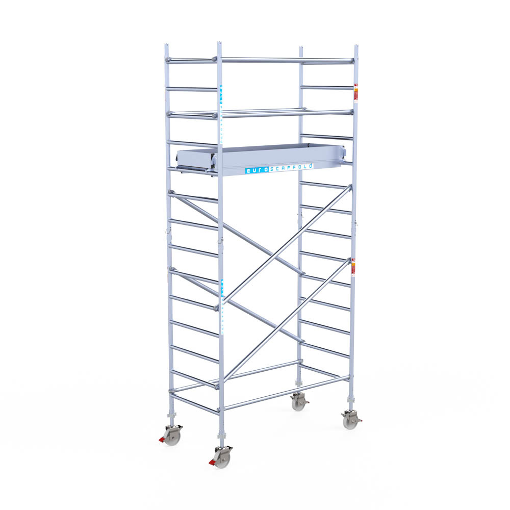 Let wel; Door de vernieuwde EN 1004 norm en het A-blad rolsteigers voldoen de Euroscaffold Euro met enkel schoren zonder voorloopleuning niet meer aan de regelgeving voor zakelijk gebruik. De Euro uitvoering met voorloopleuningen voldoen hier wel aan. Voor particulier gebruik is de uitvoering met schoren wel voldoende.