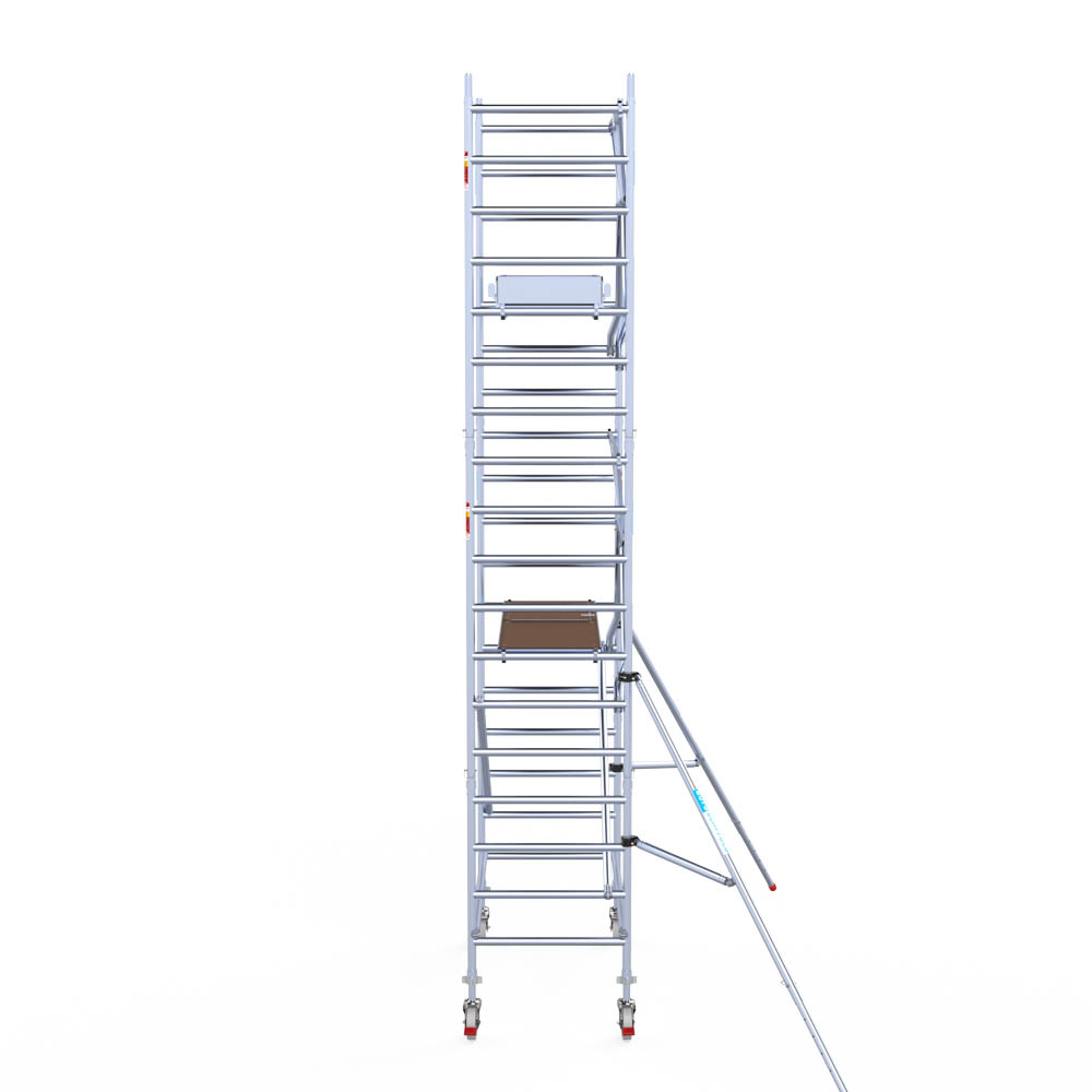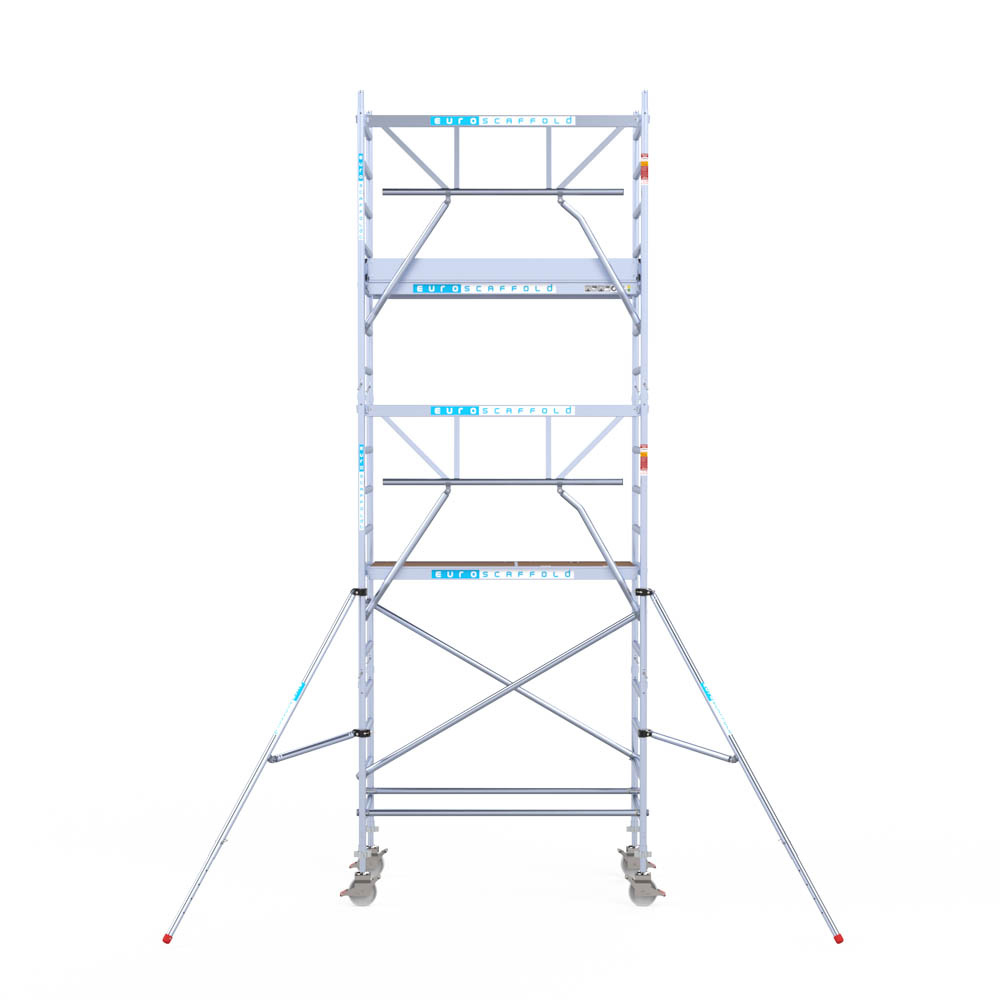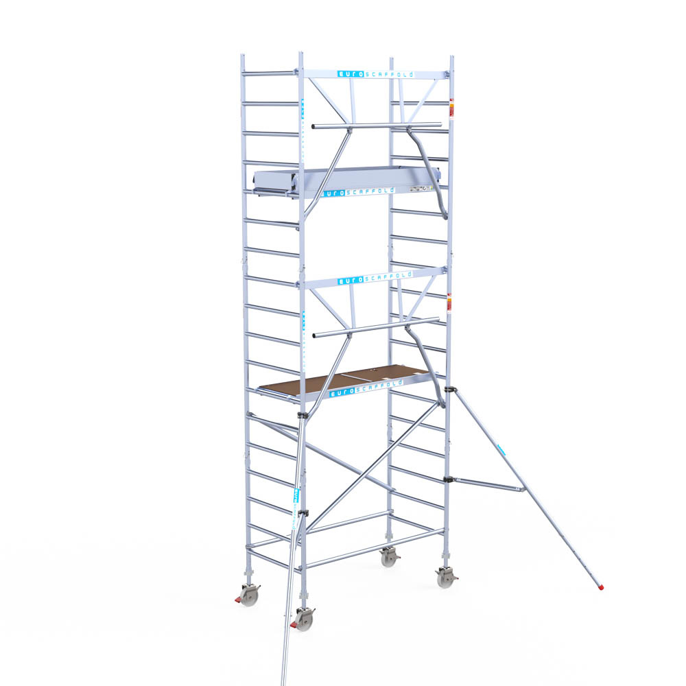 Let wel; Door de vernieuwde EN 1004 norm en het A-blad rolsteigers voldoen de Euroscaffold Euro met enkel schoren zonder voorloopleuning niet meer aan de regelgeving voor zakelijk gebruik. De Euro uitvoering met voorloopleuningen voldoen hier wel aan. Voor particulier gebruik is de uitvoering met schoren wel voldoende.