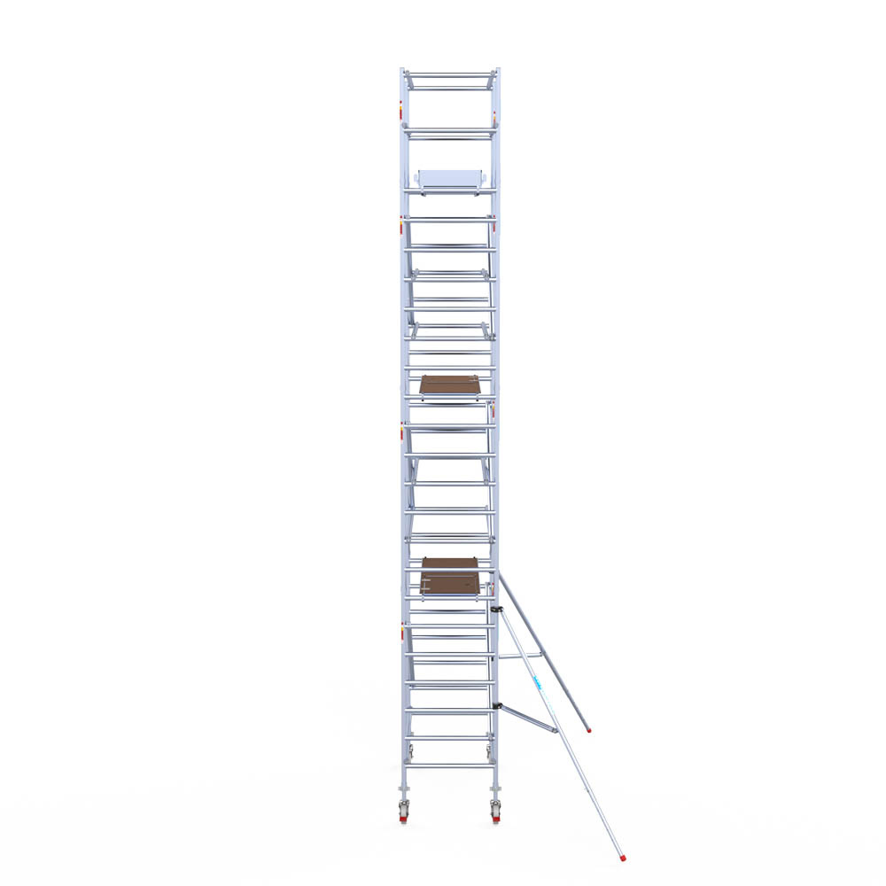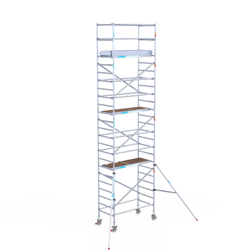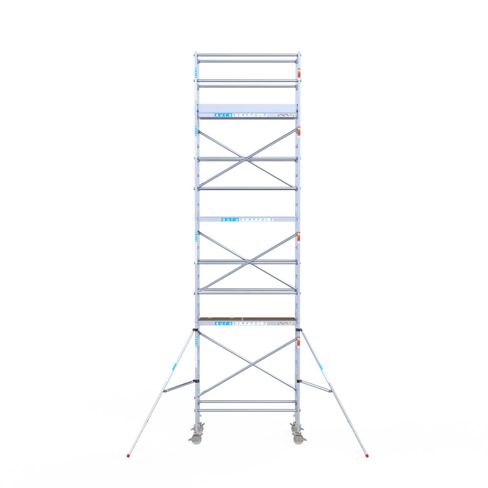 Let wel; Door de vernieuwde EN 1004 norm en het A-blad rolsteigers voldoen de Euroscaffold Euro met enkel schoren zonder voorloopleuning niet meer aan de regelgeving voor zakelijk gebruik. De Euro uitvoering met voorloopleuningen voldoen hier wel aan. Voor particulier gebruik is de uitvoering met schoren wel voldoende.
