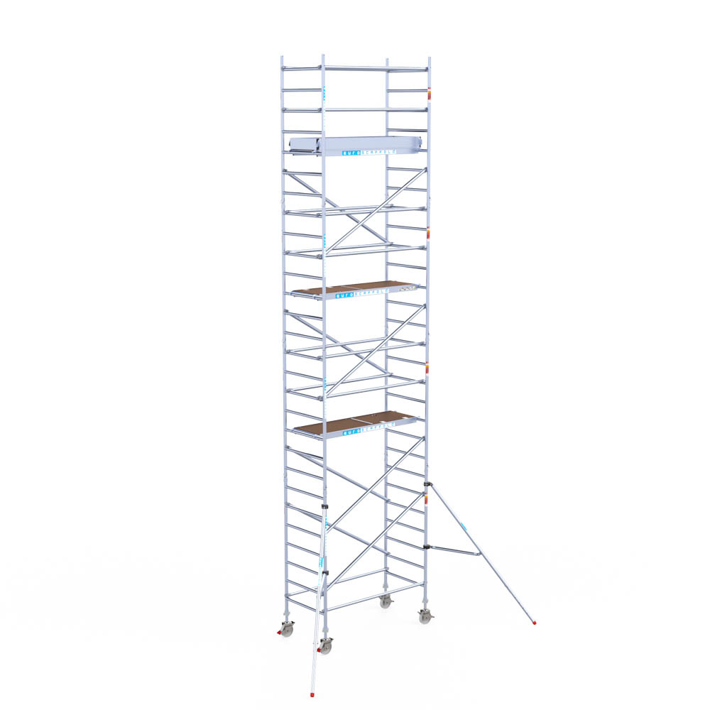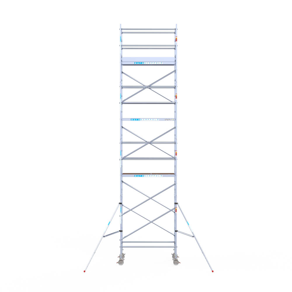 Let wel; Door de vernieuwde EN 1004 norm en het A-blad rolsteigers voldoen de Euroscaffold Euro met enkel schoren zonder voorloopleuning niet meer aan de regelgeving voor zakelijk gebruik. De Euro uitvoering met voorloopleuningen voldoen hier wel aan. Voor particulier gebruik is de uitvoering met schoren wel voldoende.