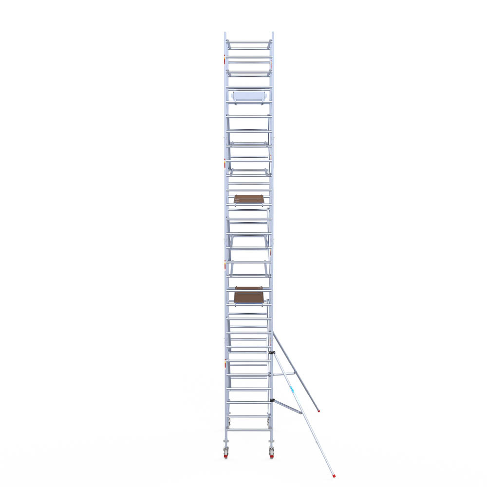 Deze rolsteiger heeft een steigerbreedte van 90, wat voor stabiliteit en stevigheid zorgt. De platformlengte is 190, wat voldoende werkruimte biedt. De werkhoogte van de rolsteiger is 9,2, waardoor je veilig op de gewenste hoogte kunt werken.