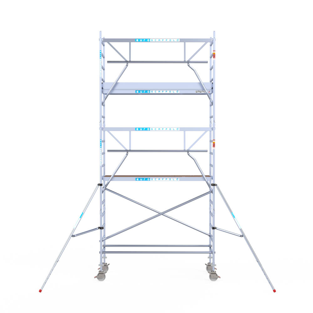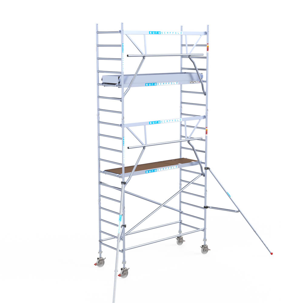 Let wel; Door de vernieuwde EN 1004 norm en het A-blad rolsteigers voldoen de Euroscaffold Euro met enkel schoren zonder voorloopleuning niet meer aan de regelgeving voor zakelijk gebruik. De Euro uitvoering met voorloopleuningen voldoen hier wel aan. Voor particulier gebruik is de uitvoering met schoren wel voldoende.